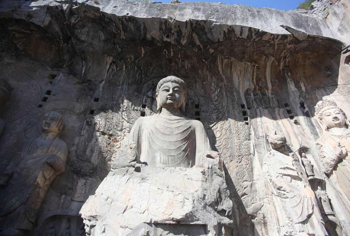 Традиция вырезать в скале гроты со статуями Будды пришла в Китай из Индии вместе с буддизмом. Скульптуры в гротах и на склонах, надписи и графические элементы свидетельствуют об определённых изменениях стиля, связанных со временем их создания. Самые крупные гроты с известными скульптурами и надписями: Гуанг-донг, работа в котором началась в 493 году, Биньянг-донг - 505 год, Лианхуа-донг - 520 год, Шику-си - 520 год, Шиску - 520 год, Яофанг-донг - 570 год, Дзайфу-донг - 636 год, Фахья-донг - 650 год. Надписи здесь самые разные, например одни выражают причины, по которым человек решил создать здесь буддистскую статую, другие отмечают добрые и благочестивые дела, а третьи - это просто записи о путешествиях или выражения людских эмоций. Все эти изречения искусно выполнены в самых разных стилях каллиграфии: печатные иероглифы, официальный шрифт, наклонный и обычный.