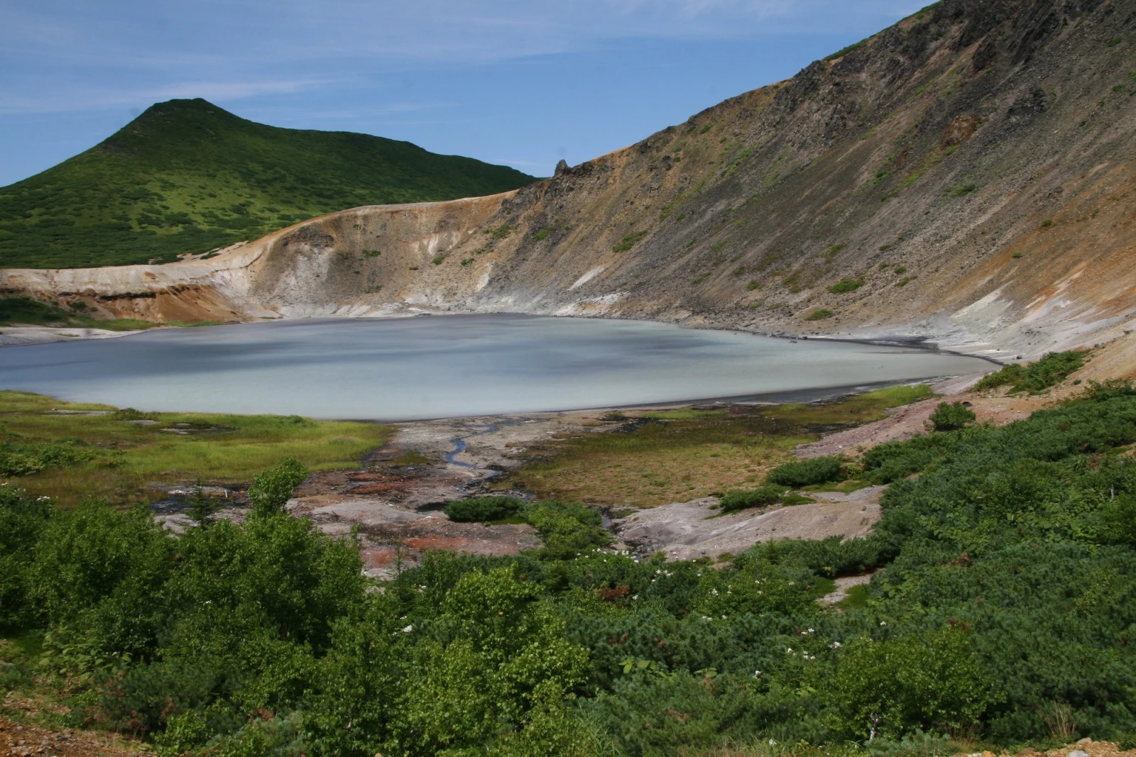 Озеро Горячее расположено внутри кальдеры вулкана Головнина на юге острова Кунашир. Это самое крупное и глубокое озеро на острове — его максимальная глубина превышает 60 метров, а форма напоминает овальный кратер, заполненный прозрачной водой с характерным серо-зелёным оттенком. Озеро окружено крутыми склонами кальдеры, поросшими кустарником и лесом, а в его окрестностях активно проявляются поствулканические процессы.