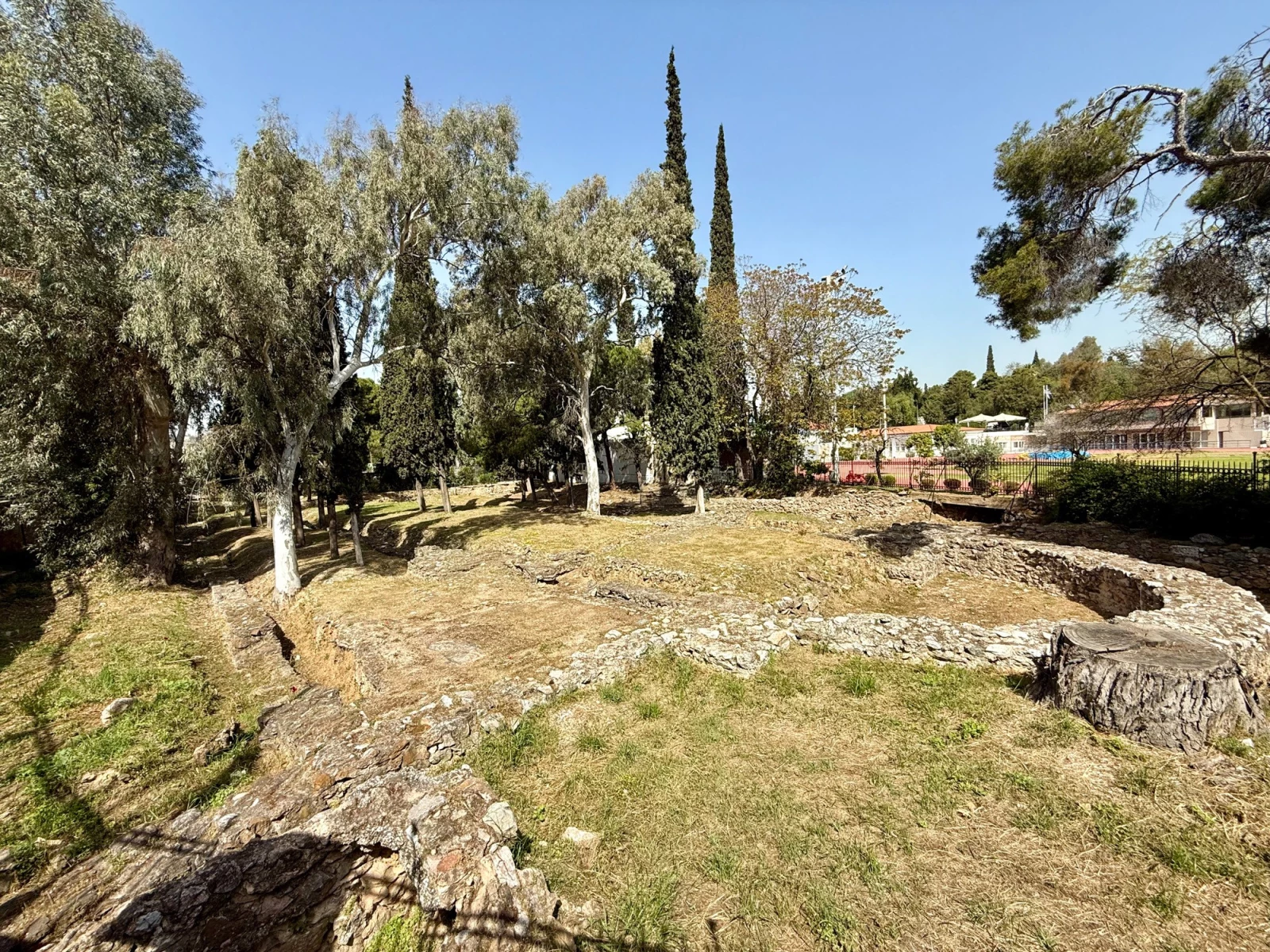 Особое внимание привлекает мозаичный пол базилики, выполненный с исключительным мастерством. Орнаменты сочетают римские и христианские традиции: гильоше, розетки, виноградные лозы с гроздьями, лавровые венки, кресты и изображения птиц. Цветовая палитра мозаик включает белый, чёрный, тёмно-красный, оранжевый, серый, бледно-фиолетовый, коричневый, жёлтый, розовый, синий и зелёный цвета. Один из фрагментов мозаики, изображающий аиста, клюющего змею, хранится в Византийском и Христианском музее Афин.