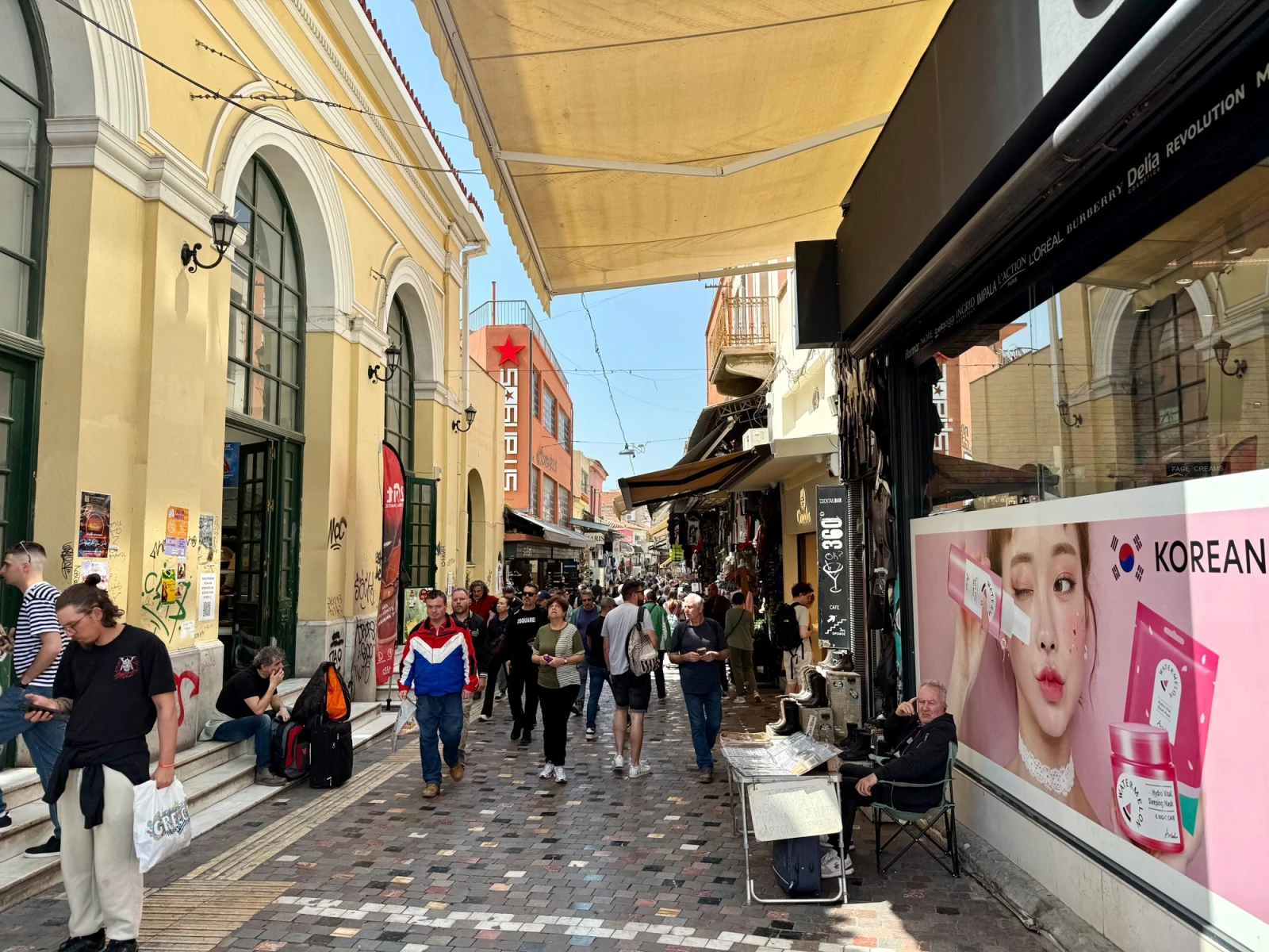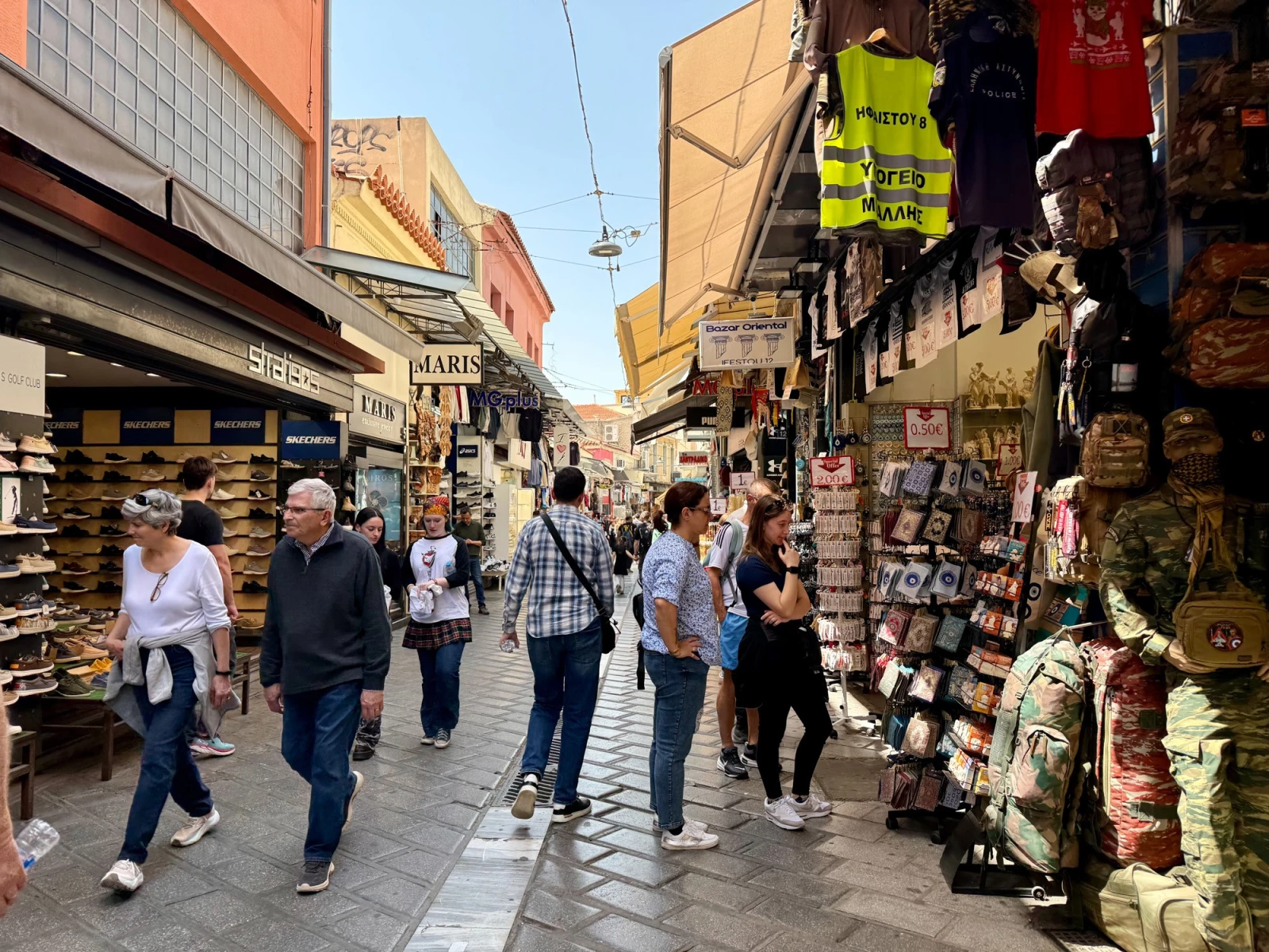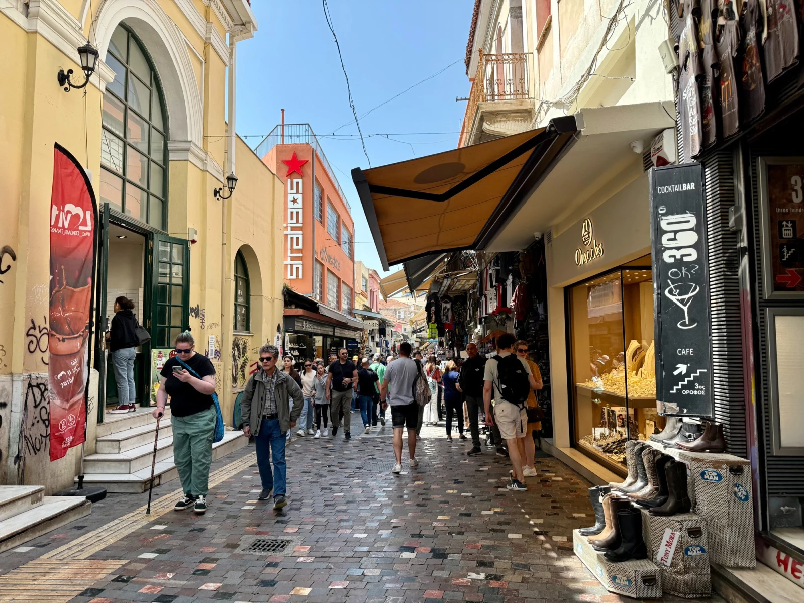 Монастираки славится своим блошиным рынком, магазинами антиквариата, лавками с сувенирами, ремесленными изделиями, букинистическими киосками, уличными музыкантами и атмосферными кафе с видом на Акрополь. Здесь можно почувствовать ритм города, познакомиться с его культурной многослойностью и насладиться непринуждённой, подлинной атмосферой афинского быта.