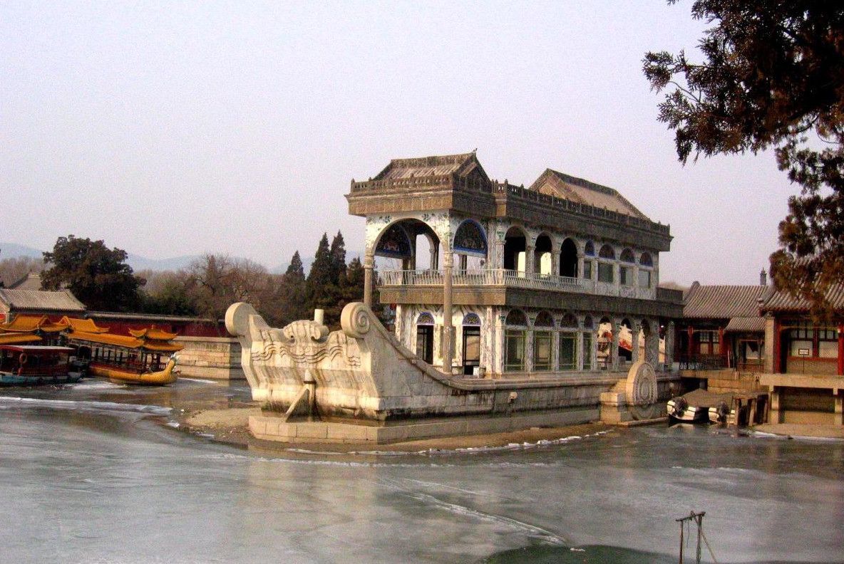 В самом конце Длинной галереи у берега стоит каменный корабль - знаменитая Мраморная ладья. Правда из мрамора сделано только основание корабля, а двухэтажная надстройка сделана из дерева и только окрашена под мрамор. Корабль был построен в 1755 году. При императрице Цыси каменный корабль играл роль павильона для чайных церемоний.