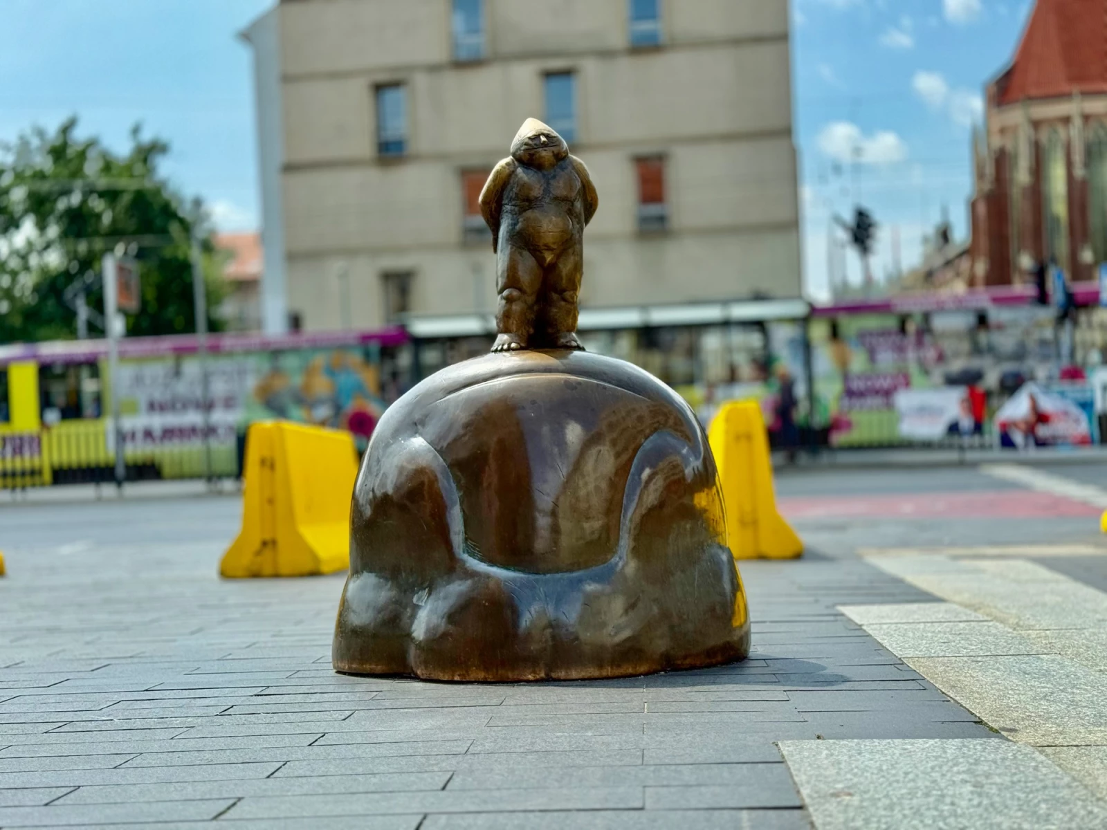 Гном Папа (Krasnal Papa) расположен на улице Швидницкой в центре Вроцлава. Это первая и самая крупная скульптура вроцлавских гномов, установленная в 2001 году в рамках увековечивания деятельности движения «Оранжевая альтернатива». Это абсурдистское и мирное протестное течение 1980-х годов использовало образ гнома как символ иронии, несогласия и народного юмора в противовес тоталитарной риторике. Папа-гном стал визуальным воплощением этой идеи и дал начало целой традиции уличных гномов, распространившейся по всему городу.