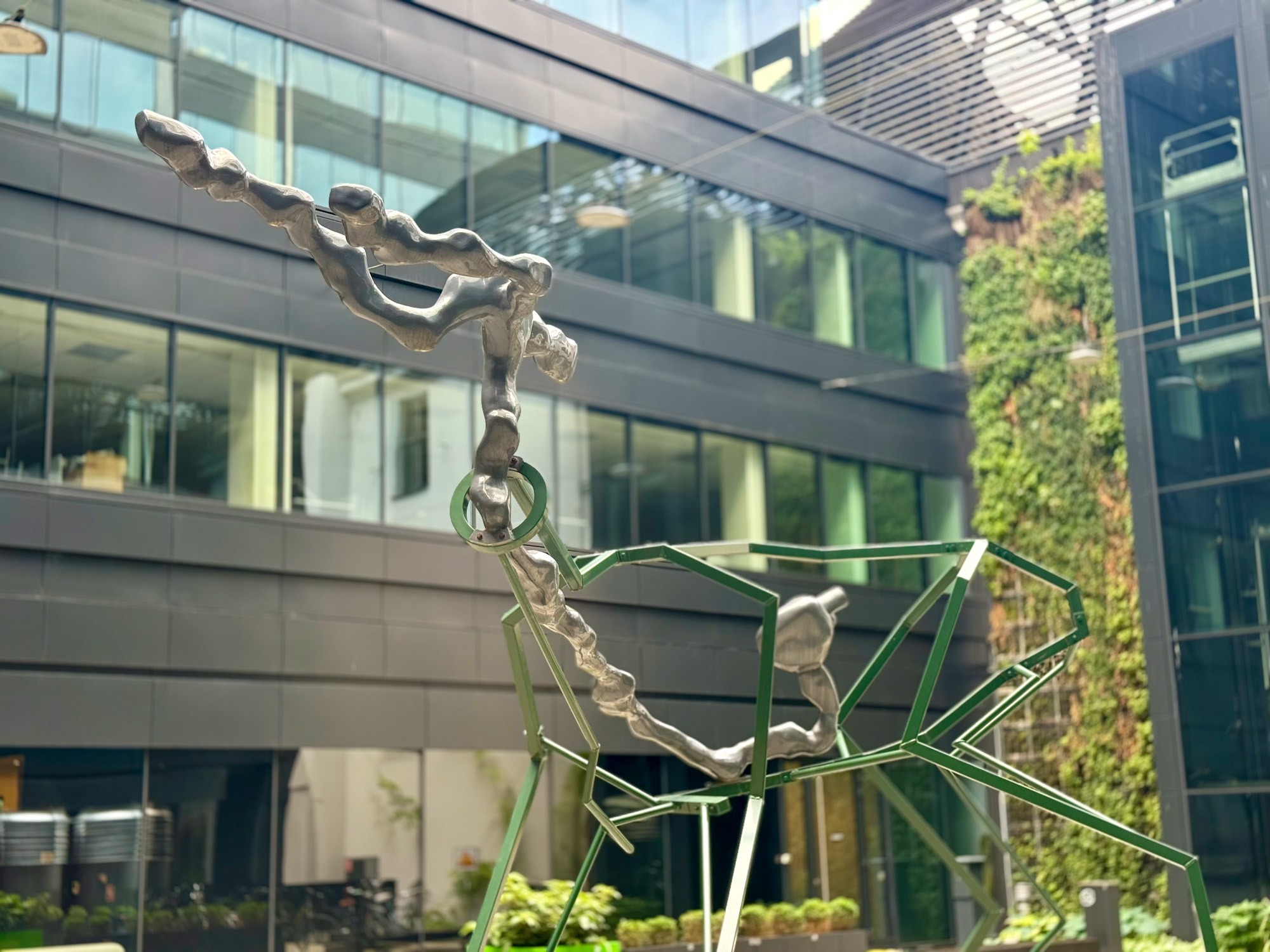 Объект представляет собой современное произведение искусства, интегрированное в городскую архитектуру. Он находится на открытом патио, доступном для посетителей, сотрудников офисов и прохожих. Пространство окружено зелёными насаждениями и элементами ландшафтного дизайна, что подчёркивает гармоничное сочетание скульптуры с окружающей средой.