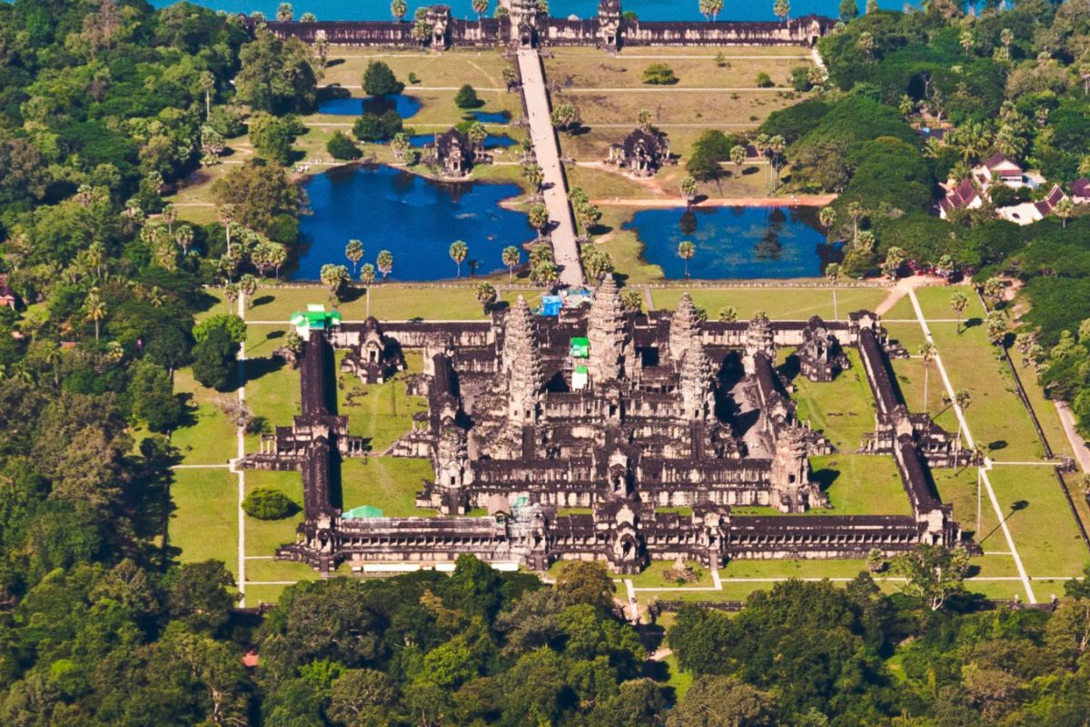 Ангор-Ват окружен рвом шириной 190 м. В старину в нем разводили крокодилов. С западной стороны ров пересекает каменная дамба, по которой и проходят в Ангор-Ват. Территория Ангкор-Вата обнесена стеной длиной 1025 м на 800 м. От ворот к храму ведет довольно длинная широкая дорога, проложенная по насыпи, поднимающейся над землей почти на полтора метра. При подходе к храму дорога проходит между двумя искусственными прудами, которые в сухой сезон иногда высыхают. Сам храм представляет собой достаточно сложную трехуровневую конструкцию со множеством лестниц и переходов. Венчают храм пять башен - одна в центре и четыре по краям крыши. Высота центральной башни, которая существенно выше остальных, составляет 42 м. Над землей же она возвышается на 65 м. Эта башня символизирует мифическую гору Меру (Meru), которая в соответствии с индуистской мифологией является центром всего мира.