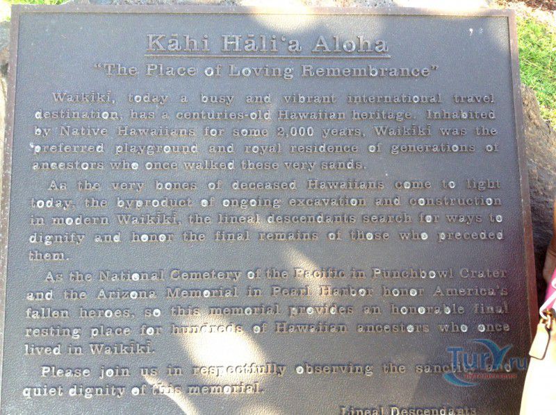 Мемориал памяти Гавайских предков Kahi Halia Aloha установлен в парке Королевы Капиолани (Queen Kapiolani Regional Park), который раскинулся на берегу Тихого океана в южной части острова Оаху, в знаменитом районе Вайкики города Гонолулу, в нескольких сотнях метров от зоопарка Гонолулу Honolulu Zoo. Мемориал, представляющий собой восьмиугольный холм, был сооружен в декабре 2001 года. Надпись на мемориале "Kahi Hali'a Aloha - The Place of Loving Remembrance" переводится как "Место любить воспоминания".