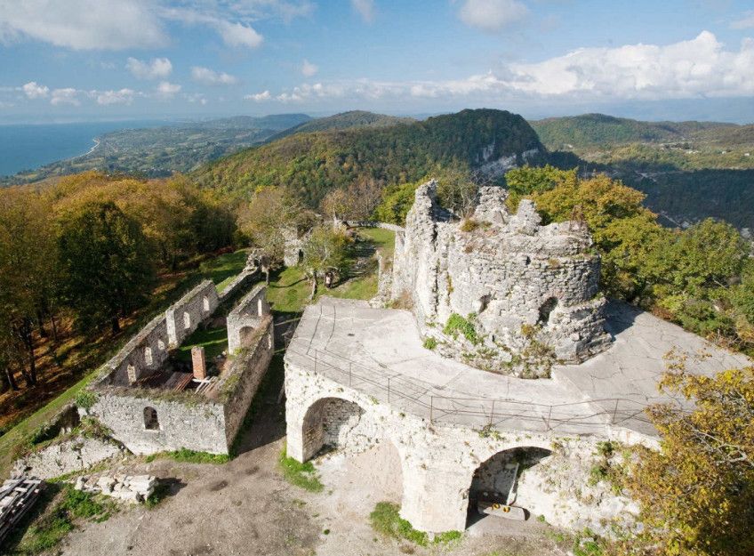 Анакопия, древняя столица Абазгского княжества и Абхазского царства, раскинулась на вершине Апсарской (Иверской) горы. Древнейшая постройка Анакопии – крепость, сооруженная во II-IV веках. В конце VII века была возведена основная линия стен средневековой Анакопии, охвативших территорию размером 450 на 150 метров. С юга, где склон горы был пологим и доступным, стена была укреплена семью башнями - квадратными (в менее доступных местах) и круглыми (в тех местах, где легко могли быть подведены стенобитные машины). Стены крепости были сложены из хорошо отёсанных и пригнанных каменных блоков, ширина некоторых достигает 60 сантиметров. Попасть внутрь крепости можно было только через небольшие ворота, построенные на южной стене из трёх огромных монолитов тёсаного известняка. Наиболее примечательной является западная круглая башня, расположение и форма которой позволяли вести из неё обстрел противника под углом почти в 290 градусов. Главная восточная башня была возведена в середине XI века и стала центральным наблюдательным пунктом цитадели. В VIII веке в крепости обосновался абхазский правитель Леон I. При нём Анакопия стала столицей Абхазского царства, его политическим и духовным центром. На рубеже VIII-IX веков у северной стены цитадели, на самом краю обрыва, был построен храм в честь великомученика Феодора Тирона. На протяжении многих веков в Анакопийском храме хранился нерукотворный образ Пресвятой Богородицы. До наших дней от храма сохранилась лишь часовня. Одним из чудес нагорной крепости считается неиссякаемый колодец с целебной водой, привлекающий тысячи паломников и туристов.