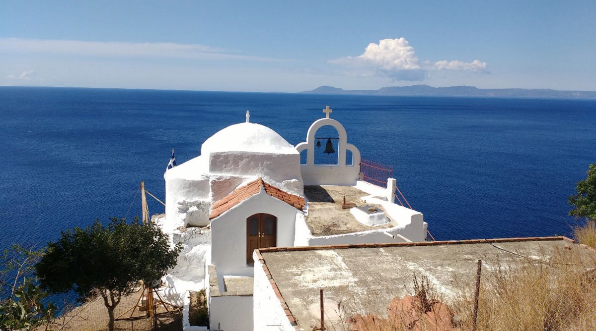 Маленькая белая церквушка Святой Ирины буквально висит на скале. Византийская церковь крестообразного стиля была построена на развалинах ещё более древнего монастыря, в котором имелся резервуар для сбора воды.