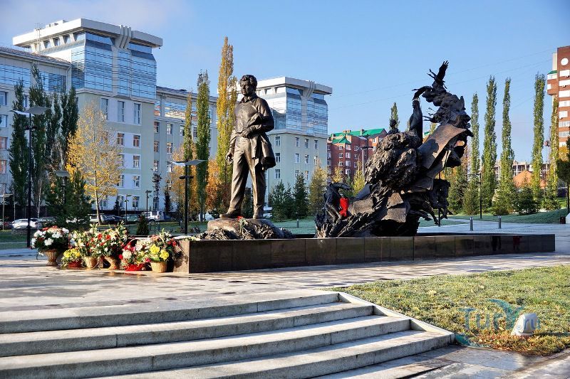 Памятник посвящен народному поэту Башкортостана, корифею советской литературы, писателю-фронтовику Мустаю Кариму. Этот человек был очень большим деятелем, он был Героем Социалистического труда, поэтом Башкирской АССР, членом ВКП(б), лауреатом Ленинской и Государственной премий СССР. Внушительная скульптурная композиция воздвигнута недалеко от дома, где семья писателя прожила 40 лет, совсем недалеко несколько десятилетий назад здесь стоял частный дом, где снимал угол студент Мустафа Каримов, приехавший учиться в Уфу из деревни Кляшево Чишминского района. Именно там он познакомился со своей будущей супругой Раузой.