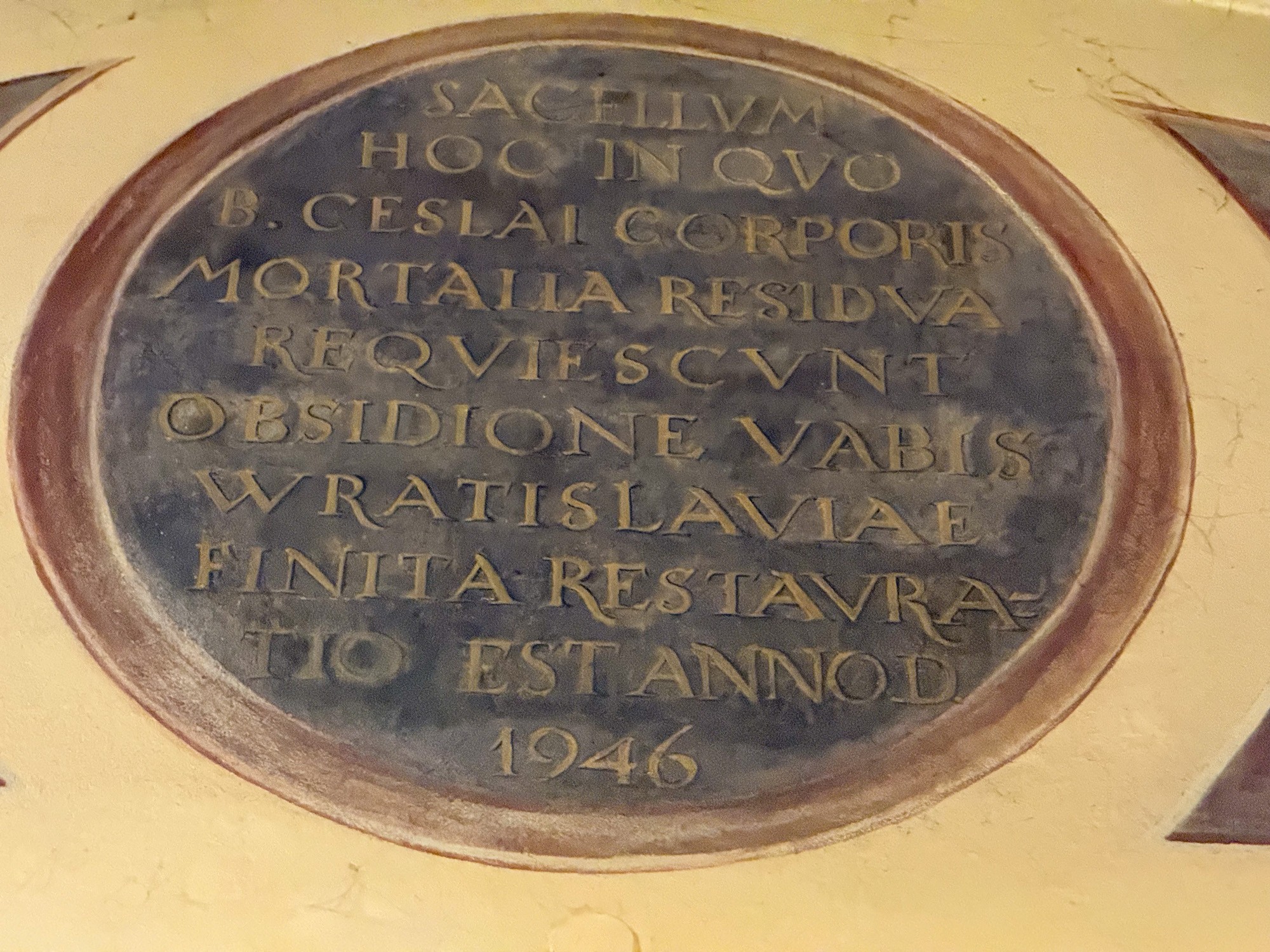 Каплица, посвящённая его памяти, была построена в XVII веке и стала местом, где хранятся его мощи. Интерьер часовни выполнен в стиле барокко с ярко выраженными элементами позднего ренессанса. В центре возвышается саркофаг с телом блаженного, украшенный скульптурной композицией, изображающей Чеслава в момент молитвы, с символическим небесным светом над головой.