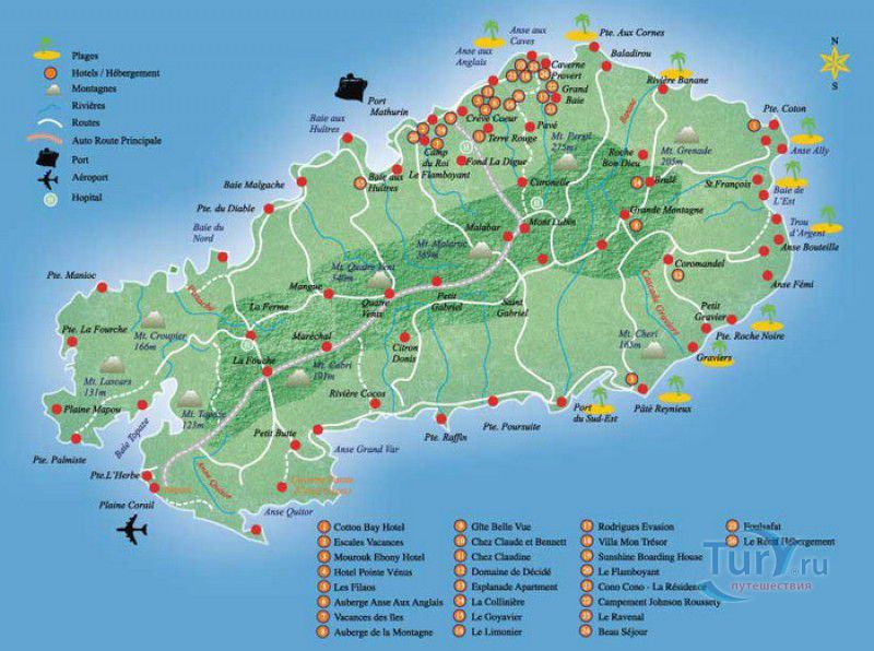 Остров Родригес - остров вулканического происхождения, расположен посреди Индийского океана, в 650 км на северо-восток от острова Маврикий. Родригес - самый восточный и самый маленький из Маскаренских островов, является одним из автономных Внешних островов в составе Республики Маврикий, назван в честь португальского мореплавателя Диего Родригеса, открывшего остров. Площадь острова 108 квадратных километров, его длина - 18 километров, ширина - 8 километров, самая высокая точка - гора Mont Limon (Мон Лимон), высота которой составляет 398 метров над уровнем моря. Остров Родригес со всех сторон окружён коралловыми рифами, рельеф острова холмистый, центральная его часть полностью покрыта пышной тропической растительностью, береговая линия изрезанная, есть множество скалистых уединённых бухт, утёсов и небольших заливов. В юго-западной части острова есть множество карстовых пещер, в числе которых знаменитые Caverne Patate, Caverne Tamarin и Grande Caverne. Побережье лагуны острова (её площадь в 2 раза больше площади суши) славится бескрайними пляжами из белого песка и богатым подводным миром. Флора и фауна острова богата и разнообразна, многие виды растений и животных являются эндемиками, многие виды, к сожалению, вымерли или находятся на грани исчезновения. Остров пользуется популярностью у поклонников эко-туризма и дайверов. Любители спокойного отдыха отдают предпочтение пляжам острова, экскурсиям по его живописным местам и знакомству с историей и традициями местных жителей, любители активного отдыха могут заняться дайвингом, кайтсёрфингом, виндсёрфингом, парусным спортом, отправиться на подводную рыбалку и побывать в пещерах, считающихся одними из самых красивых в мире.