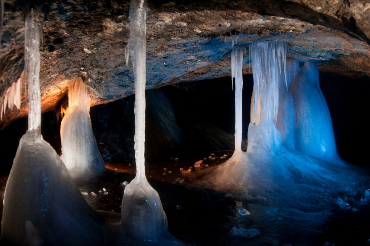 Аскинская ледяная пещера - это крупнейшая полость Южного Урала мешкообразного типа с наибольшим по площади ледником и самыми крупными ледяными сталагмитами. Пещера представляет собой большой зал длиной 104 метра, максимальной шириной 61 метр, высота пещеры достигает 26 метров. Пещера имеет аркообразный вход, обращенный на северо-восток. Спускаться в пещеру приходится по крутому склону высотой около 15 метров. Не стоит беспокоиться, спуск к входу в пещеру оборудован лестницей с перилами, просто нужно быть предельно аккуратным, поскольку лестница тоже покрывается льдом. В огромном зале со сводчатыми стенами и потолком почти весь пол покрыт ледником. В разные годы здесь насчитывалось от 7 до 10 гигантских ледяных сталагмитов высотой от 8 до 11 метров, диаметр в основании которых достигал 5 метров. Потолок ледяной пещеры покрыт коркой натечного известняка, местами он обледенел. С потолка и стен свисают сталактиты самой различной формы и величины. В юго-восточной и юго-западной стенах зала имеются два слепых хода. Пещера обладает уникальной акустикой - многоголосое, долго не умолкающее эхо, многократно повторяет каждый звук.