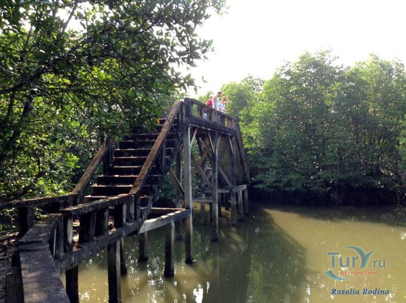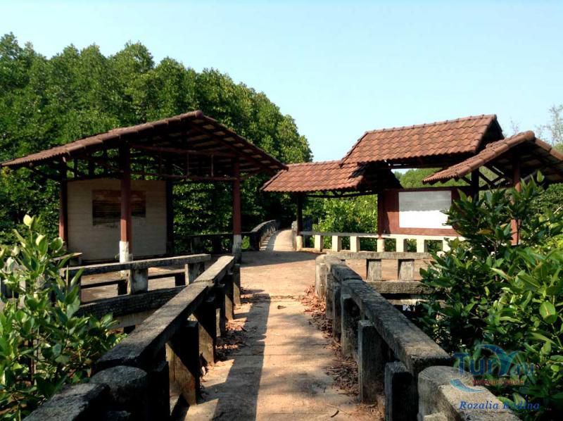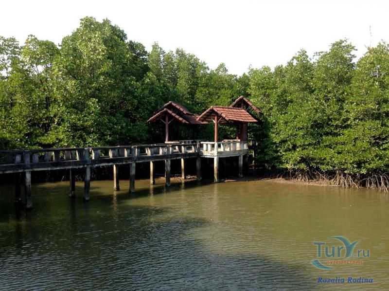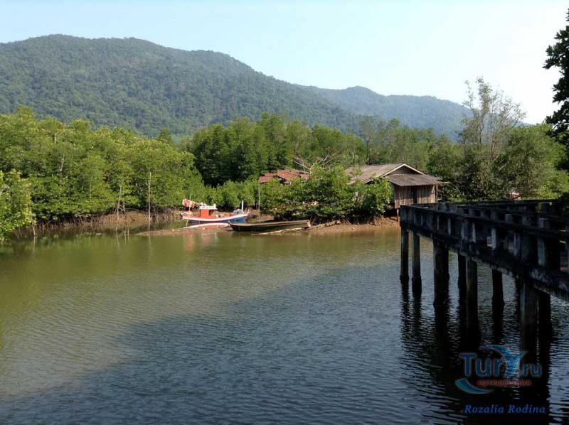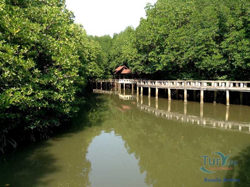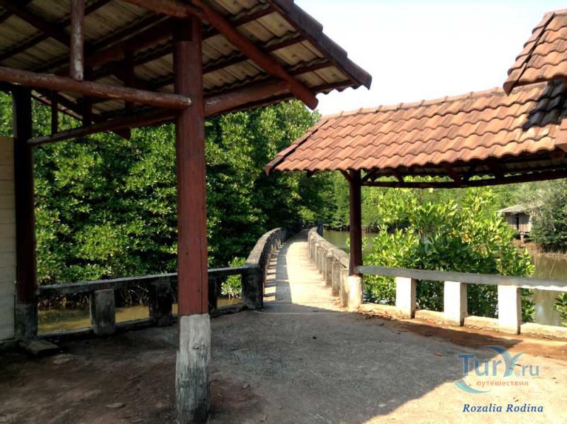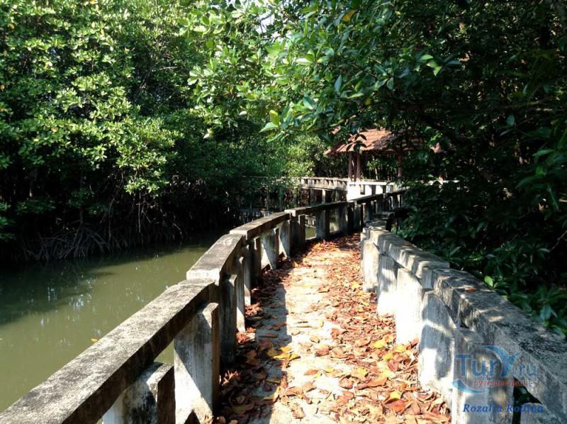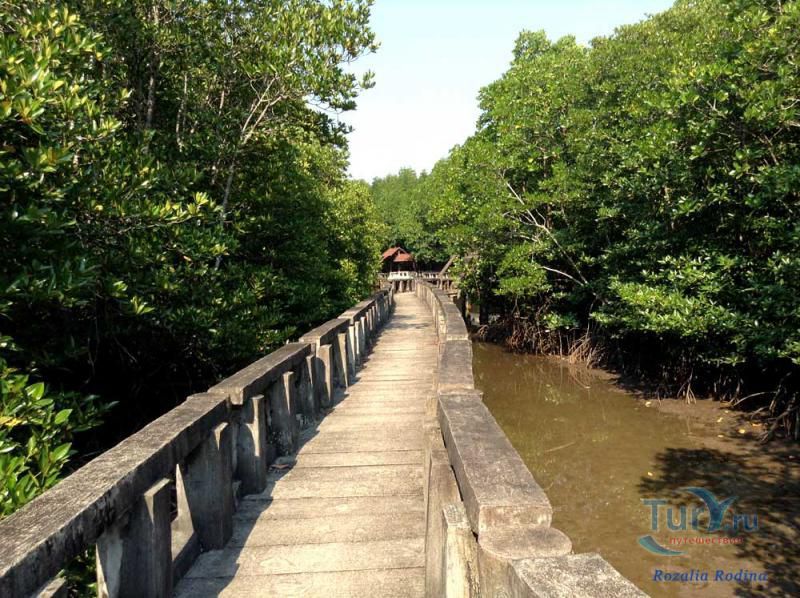 Практически в самом центре деревни Бан-Са-Лак-Кхок (Ban Sa Lak Khok), которая расположена в юго-восточной части острова Ко-Чанг, в провинции Трат Восточного Тайланда, находится одно интересное для туристов место - это длинная дорога по Мангровым зарослям. Сама дорога представляет собой шедевр творения рук человеческих - эта железобетонная конструкция на высоких сваях со множеством поворотов, изгибов, ступенек, мостиков и крытых мест для отдыха длиной в несколько километров. Даже в самое знойное время идти по дороге вполне комфортно - густые сочные кроны мангровых деревьев спасают от палящих лучей солнца, а легкий ветерок освежает идущих. Здесь путешественник попадает в другой, особый мир дикой природы - блестящие крупные листья мангровых деревьев ярко-зеленого цвета сплошным ковром покрывают огромную площадь зарослей, лишь кое-где оставляя путь каналам - водным артериям, питающим мангры. Многочисленные, переплетенные между собой немыслимым образом, корни деревьев поддерживают мощный ствол и увесистую крону, приподнимая их высоко над болотистой жижей. Глядя на эту картину, понимаешь, что если бы не эта дорога на сваях, то вряд ли бы кто-то решился по своей воле вторгнуться во владения мангровых зарослей и пройтись своими ногами по их миру. На это можно только смотреть - смотреть и удивляться разнообразию жизни на нашей планете Земля. Где-то посреди пути по бетонному лабиринту дороги стоит высокая смотровая вышка, взобравшись на которую, можно обозревать километры ярко-зеленого покрывала мангровых зарослей, раскинувшегося на все четыре стороны, и ленты каналов, добавляющие к зеленому свои шоколадные оттенки.