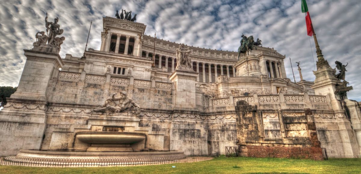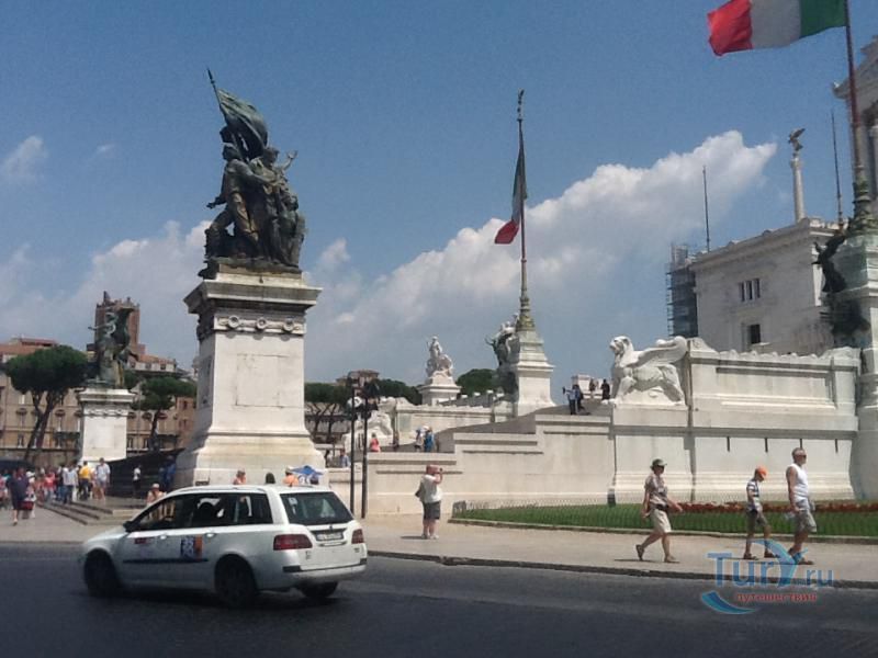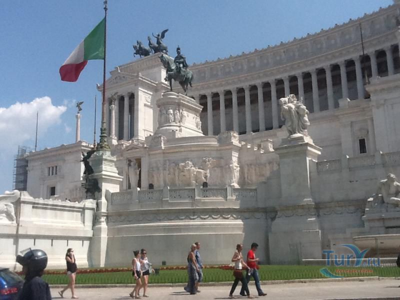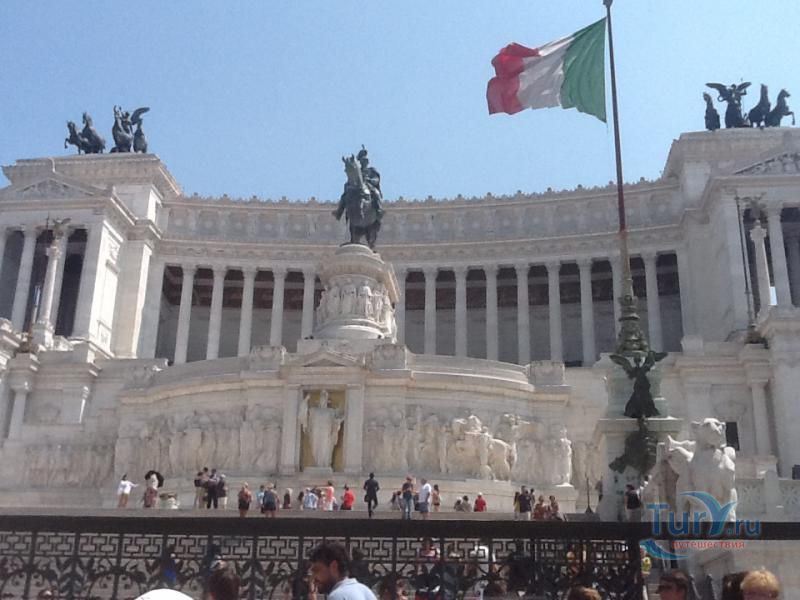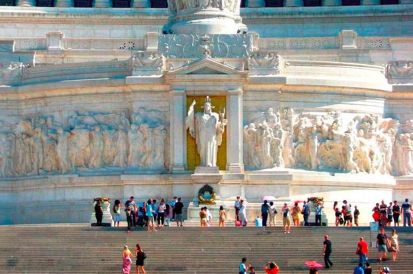 Белоснежный монументальный и помпезный АЛТАРЬ ОТЕЧЕСТВА на площади Венеции. Алтарь Отечества, он же - монумент объединителю Италии королю Виктору Эммануилу II. Во внутренних помещениях Алтаря находятся Музей Рисорджименто и Священная коллекция знамен. Алтарь служит прекрасным центральным ориентиром и маяком для туристов. Он важен хотя бы для того, чтобы понять, где они в данный момент находятся. В Алтарь Отечества можно войти внутрь и подняться на обзорную площадку. Сейчас туда ведет модерновый, в стеклянной трубе, лифт. Оттуда можно полюбоваться на бесконечность крыш Великого города, прорубленные проспекты, купола, башни, развалины.