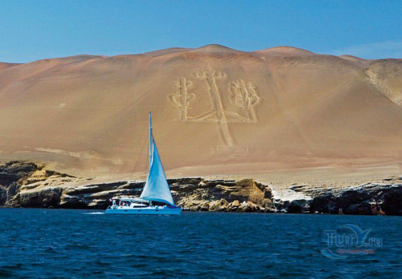 Геоглиф Андский Канделябр (Канделябр Паракаса) расположен в Перу, на северном побережье полуострова Паракас, на территории Национального заповедника Паракас. Андский канделябр вырезан на обращённом к морю склоне скалы, покрытом толстым слоем песка. Из-за постоянных ветров песок никогда не засыпает геоглиф полностью - очертания Канделябра Паракаса, похожего на огромный подсвечник с тремя свечами, всегда отлично видны как с высоты птичьего полёта, так и со стороны моря. Высота гигантского трезубца около 180 метров, ширина - 60 метров, толщина его линий составляет 3,2 метра, а глубина - от 1 до 1,2 метров. Предположительный возраст геоглифа - 2500 лет. О происхождении и предназначении Андского канделябра существует множество легенд и научных гипотез, которые пока никак не подтверждены. Некоторые учёные предполагают, что Канделябр указывает на линии Наска (группа гигантских геометрических и фигурных геоглифов на плато Наска в южной части Перу), но до них от Канделябра Паракаса более 200 километров. Другие исследователи склоняются к версии о религиозном предназначении геоглифа, а местные жители считают его элементом культа божества Виракоч - древнего бога-творца. Существует также предположение, что геоглиф служил маяком для мореплавателей - расположение и гигантские размеры Канделябра позволяют увидеть его в ясную погоду на расстоянии 20 км. Естественно, не обошлось без инопланетян, масонов, зарытых несметных сокровищ и ритуалов жертвоприношений. Достоверным является факт, что Андский Канделябр - творение древних цивилизаций. Считается, что геоглиф был создан представителями Паракасской археологической культуры, потомком которой является культура Наска. Не вызывает сомнений и то, что геоглиф "пережил" несколько тысячелетий - ни время, ни сильные морские ветра, ни песчаные бури и штормы не смогли стереть Андский канделябр с поверхности Земли.