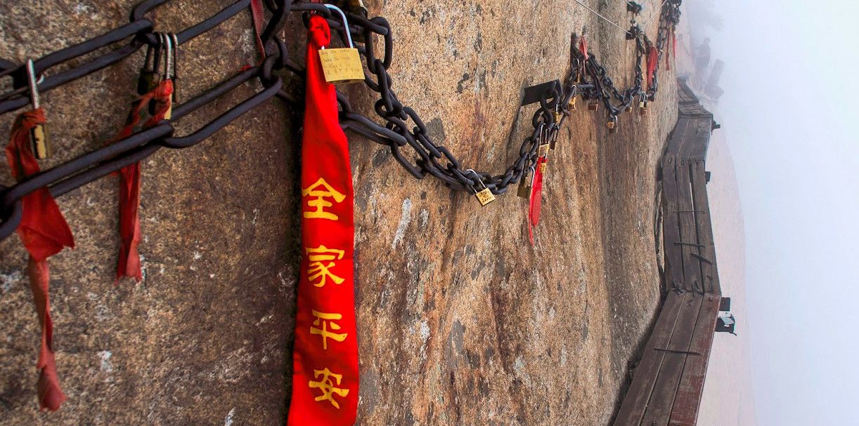Для любителей экстрима предлагается путешествие на Каменный цветок Китая - гору Хуашань. Она расположена в 120 км к востоку от Сианя и знаменита своими величественными скалами, крутыми тропами, но прежде всего — своими фантастически великолепными видами. Это одна из пяти священных гор Китая, и здесь пролегает самый экстремальный туристический маршрут в мире. Гора Хуашань имеет пять вершин: Южная, Северная, Западная, Восточная и Центральная, из которых Южная вершина со своими 2155 метрами самая высокая. Все пики кажутся примерно одинаковыми и напоминают по форме лепестки цветка. Подняться на гору можно несколькими способами. С Западного входа вы сможете увидеть множество даосских храмов. С Восточного входа прийдеться пробираться по крутой каменной лестнице. И самый безопасный способ это подняться на фуникулере, он был здесь установлен в середине 90-х годов. Обычно люди выбираю канатную дорогу, которая поднимается на Северную вершину. А далее они выбирают либо Западный либо Южный пик. Большинство предпочитает Западный пик, так как этот маршрут довольно безопасен, и вид на Западную вершину просто ошеломляющий, и он еще грандиозней при совершенно ясной погоде.