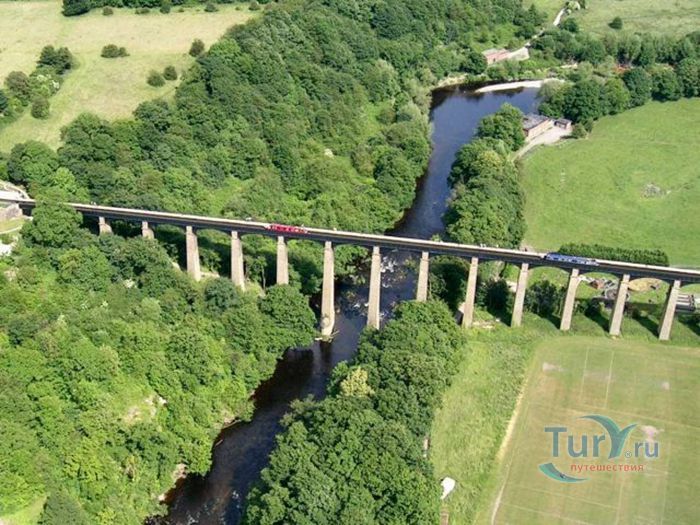 Акведук Понткисиллте - судоходный акведук протяжённостью 18 километров расположен на северо-востоке Уэльса, в графстве Рексем, Великобритания. Он проходит над долиной реки Ди и идеально вписывается в сложный ландшафт этой местности. По Акведуку проходит канал Лланголлен, располагается между деревнями Кевн-Маур и Вронкисиллте и является самым длинным и высоким акведуком в Великобритании. Высота канала в обеих сторон реки составляет 38 метров. Строительство акведука началось в 1795 году по проекту инженера Томаса Телфорда. Опоры строились полыми для уменьшения веса, строительный раствор состоял из извести, воды и бычьей крови. Официальное открытие этого, по словам Вальтера Скотта, произведения искусства состоялось в 1805 году. И с тех пор акведук является одним из наиболее загруженных участков канальной сети Великобритании, пропуская около 15 000 лодок в год. К своему 200 юбилею акведук ремонтировался. В 2009 году акведук Понткисиллте был внесен в список Всемирного наследия ЮНЕСКО. В настоящее время именно туристические путешествия по акведуку приобретают всё большую популярность. И это не удивительно, потому что находится он в очень живописной местности Рексема.