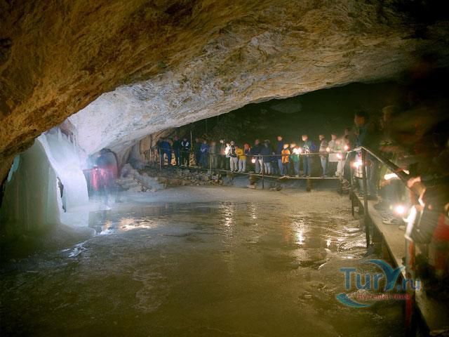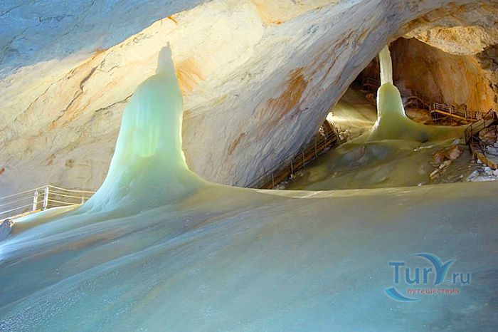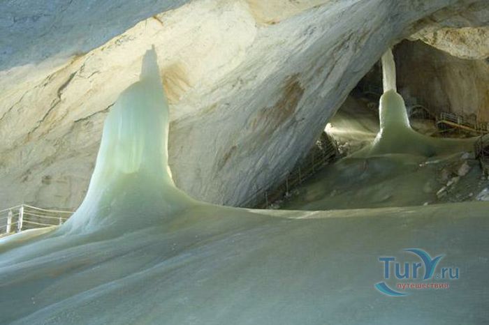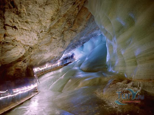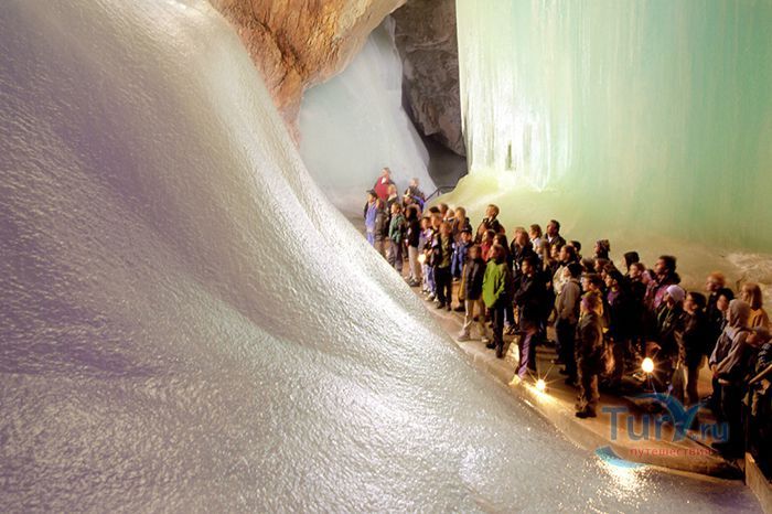 Королевство ледяных великанов - Ледяная пещера Айсризенвельт в Верфене, расположена в Австрийских горах, вблизи маленького городка Верфен, в 40 км к югу от Зальцбурга. Это уникальное природное диво представляет собой ледяные лабиринты, протянувшиеся на 42 километра. Хотя для посещения туристов открыто несколько километров, но это путешествие удивит даже очень искушенного пещерного исследователя. Ледяная Пещера Айсризенвельт - самая большая в мире пещера, в которой лёд сохраняется круглый год, расположена на высоте 1600 метров. Подняться к пещере можно либо на канатной дороге, либо пешком по очень крутому подъёму (без канатной дороги). В любом случае вы можете лицезреть потрясающие виды Австрийских гор. Хорошая физическая форма и тёплая одежда - это то, что вам безусловно понадобиться в этом путешествии. В пещере вы можете увидеть причудливые ледяные изваяния, фигуры всевозможных размеров и форм, застывшие ледяные водопады, гроты и замёрзшие озёра - всё, что может изумить своим великолепием. Добро пожаловать в Айсризенвельт - чарующее царство Ледяных Великанов!