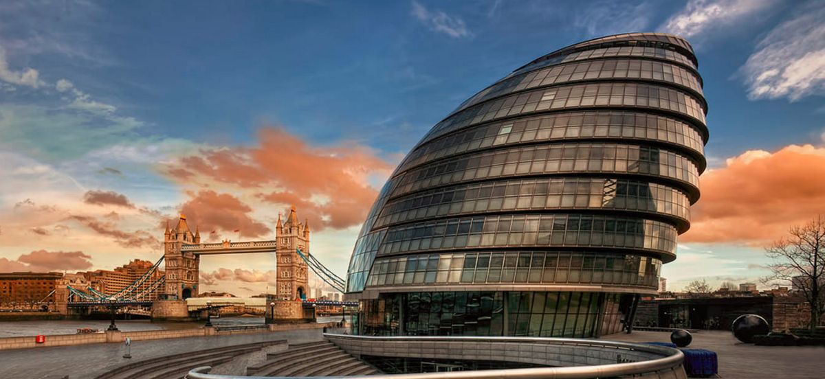 Сити-холл – десятиэтажное здание нестандартной формы, служащее резиденцией Администрации Большого Лондона. Расположено в Ламбете – административной единице Лондона, на южном берегу Темзы, неподалеку от Тауэрского моста. Его строительство длилось 5 лет и завершилось в 1998 году. Суммарный бюджет составил 65 миллионов фунтов. Свою известность Сити-холл приобрел благодаря необычной форме 45-ти метровой архитектурной конструкции, которая напоминает наклоненное яйцо с выделенными горизонтальными линиями смещенных в одну сторону этажей. За счет наклона стеклянного здания в сторону юга, его противоположная – северная часть может собирать больше световых и тепловых лучей. Навес над поверхностью земли южной части, не позволяет солнечной активности причинять дискомфорт работающим в здании. Благодаря такой асимметричности, на все этажи попадает оптимальное количество света. Задумка создания сферического здания, заключается в стремлении экономить электроэнергию. Зодчий здания - Норман Фостер, известный британский архитектор, который главными качествами своих творений считал простоту, экологичность и целесообразность. Сити-холл накрыт 3844 стеклянными плитами, каждая из которых не повторяет остальные. Внутри здания есть винтовая лестница, по которой можно подняться на десятый этаж, называемый «Лондонской гостиной», вся площадь которого используется для проведения выставок и встреч.