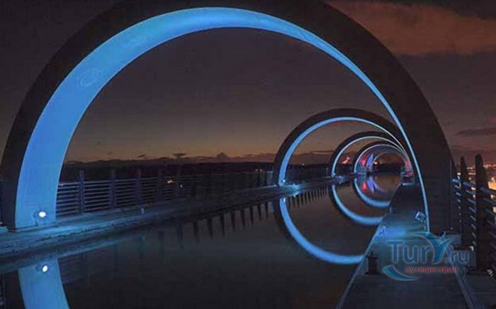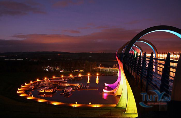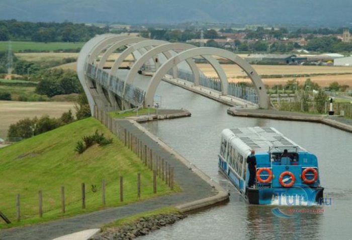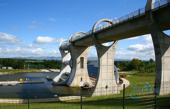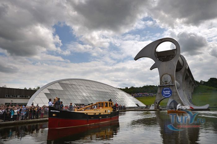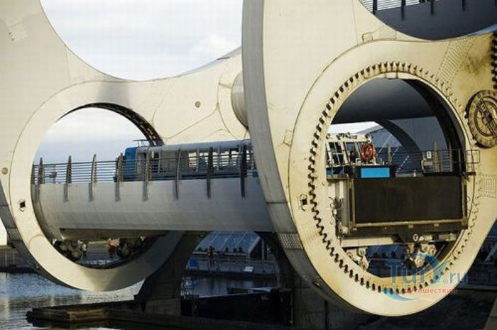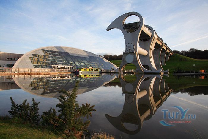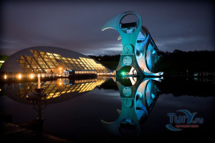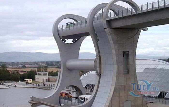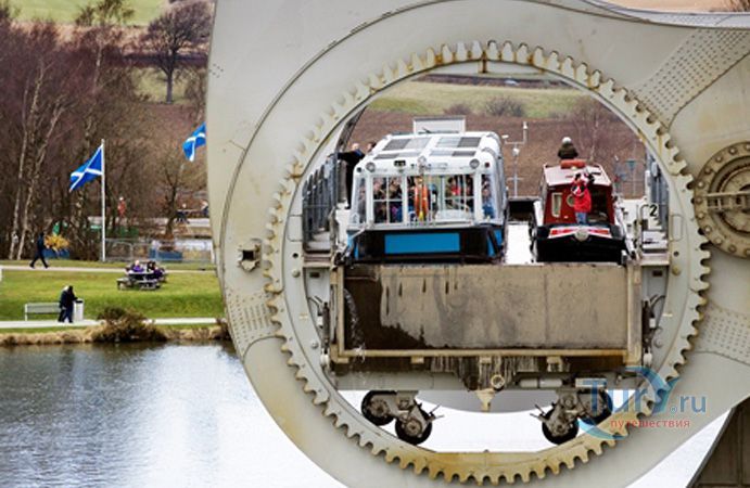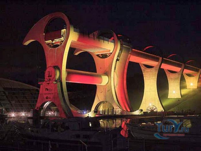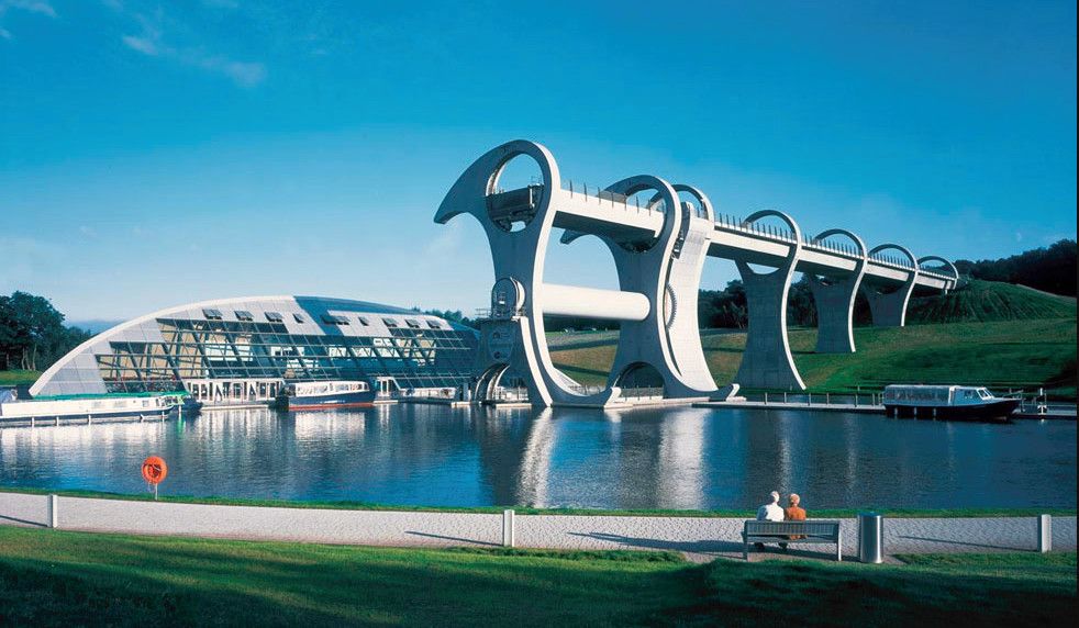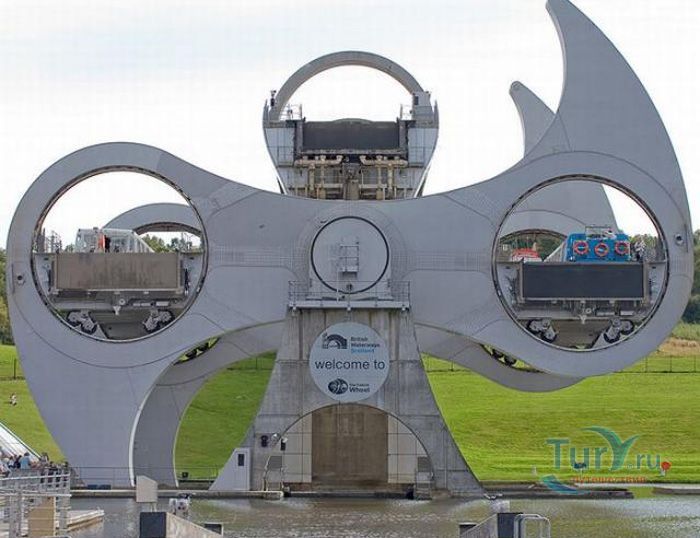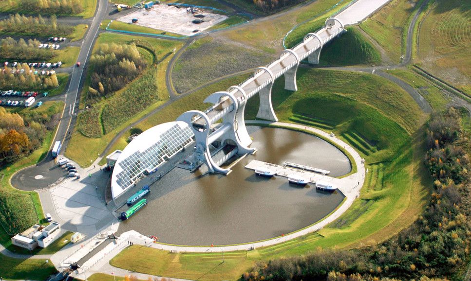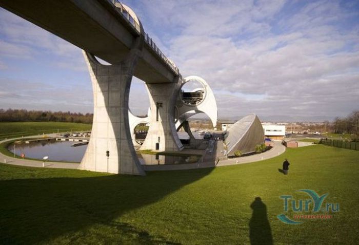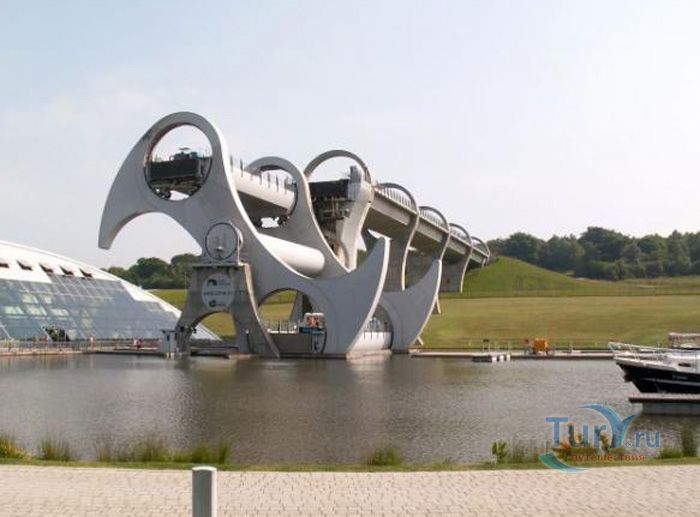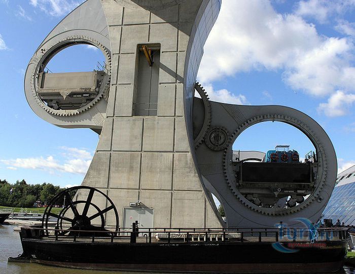 Фолкеркское колесо – это первый в мире вращающийся судоподъёмник, расположен недалеко от города Фолкерк в центральном районе Шотландии. Он соединяет два искусственных канала Форт-Клайд и Юнион, которые изначально были соединены шлюзами. Однако, в 1933 году их засыпали и больше не использовали до 1998 года. Тогда, в рамках проекта по возобновлению судоходства по каналам, под названием «Миллениум Линк», было предложено использовать более компактное сооружение, которое бы отвечало всем необходимым требованиям. После длительных дискуссий остановились на современном проекте подъёма и спуска судов. Торжественное открытие состоялось 24 мая 2002 года с участием королевы Елизаветы II. Она открыла колесо в рамках празднования своего золотого юбилея. Система перепадов высот между двумя каналами составляет 22 метра, а канал Юнион расположен на 11 метров выше, чем Акведук, ведущий к судоподъёмнику. Поэтому лодки проходят через два шлюза. Диаметр судоподъёмника 35 метров, а длина основной оси составляет 100 метров. К основной оси крепятся два оригинальных лотка, по форме напоминающие кельтский двойной топор. Система подъёма и опускания судов работает по гидравлическому принципу. Колесо перемещает суда, поднимая и опуская две ёмкости, наполненные водой, грузоподъёмностью 300 тонн каждая. По закону Архимеда ёмкости уравновешиваются, вытесняя воду, суда перемещаются, и колесо оборачивается вокруг своей оси на 180 градусов. В 2003 году Фолкеркское колесо назвали лучшим оригинальным сооружением в области дизайна. Само колесо стало излюбленным местом туристов, а вблизи него работает обширная инфраструктура с детскими площадками, магазинами и кафе.