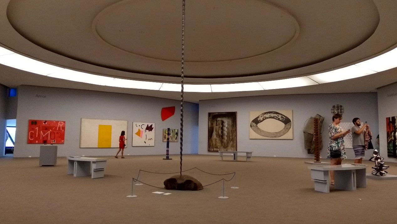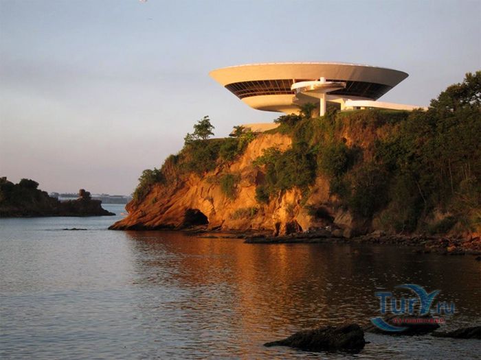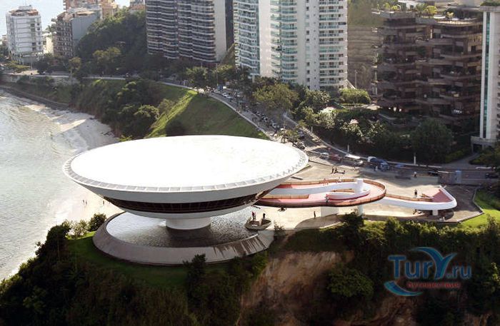 Музей современного искусства расположен в городе Нитерой, Бразилия. Это знаменитое архитектурное творение в стиле модернизма принадлежит Оскару Нимейеру. Музей строился на протяжении пяти лет и был торжественно открыт в 1996 году. Это здание по своей форме напоминает летающую тарелку, приземлившуюся на самом берегу залива Гуанабара. Здание является уникальным, его конструкция представляет собой шестнадцатиметровое, трёхэтажное бетонное цилиндрическое сооружение. Диаметр здания составляет 50 метров, а диаметр опорной колонны, на которой оно установлено – 9 метров. Вокруг здания находится небольшой водоём, колонна располагается посреди него, что придает зданию визуальную лёгкость. К входу в музей ведёт длинный спиралевидный пандус. Сразу после входа в музей посетитель попадает в помещение картинной галереи. Из большого панорамного окна зала музея открывается восхитительный вид на Рио-де-Жанейро, Сахарную голову, Статую Христа и другие достопримечательности. В музее действует постоянная экспозиция из 1217 работ коллекции Жоана Саттамини, которую он собирал 45 лет. Музей является настолько популярным, что некогда маленький городок, основной задачей которого являлось снабжение морепродуктами Рио-де-Жанейро, стал популярным местом для бразильских и зарубежных художников.