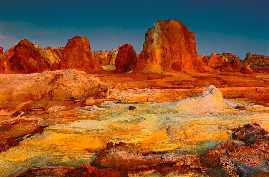 Даллол - вулканический кратер во впадине Данакиль, расположен к северо-востоку от Эрта Аль Рендж в Эфиопии, в долине Афар. Это самый низкий вулкан в мире, располагающийся на 48 метров ниже уровня моря, а диаметр кратера вулкана составляет 1450 метров. Он образовался более 900 миллионов лет тому назад. Дивные ландшафты Даллола - результат попадания базальтовой магмы в соляные шахты и последующей гидротермальной активности. Последнее извержение вулкана было зафиксировано в 1926 году. В результате этого извержения образовалось дивное озеро, вода в котором окрашена в фиолетово-жёлтый цвет. Астронавты утверждают, что пейзажи вулкана напоминают ландшафты на Ио – спутнике Юпитера. Основу этих ландшафтов составляют застывшие причудливые изваяния из лавы, серы и аднезита. Многочисленные горячие источники формируют небольшие озёра. Здесь постоянно рождаются и исчезают новые гейзеры, образуя при этом соляные конусы причудливых форм. В наши дни вулкан Даллол – одно из красивейших мест на планете, в котором мечтают побывать многие туристы и фотографы из разных стран мира. Однако, во время путешествия следует учитывать тот факт, что вулкан Даллол – это самое жаркое место на поверхности нашей планеты. Неземные пейзажи вулкана станут наградой для самых отчаянных путешественников в Эфиопии.