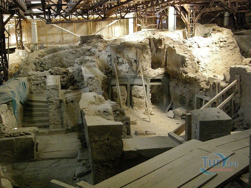 Акротири - это археологическая зона, где были найдены руины древнего минойского поселения. Имя ему дали в честь близлежащего к нему посёлка, так как оригинальное не известно. Раскопки на этом месте были начаты в 1967 году известным греческим археологом Спиридоном Маринатосом, но до сих пор полностью не завершены. Поселение было погребено под слоем пепла после извержения вулкана около 1500 года до нашей эры. Именно это позволило ему столь неплохо сохраниться. Здесь были обнаружены фрески, глиняная посуда, мебель, сложные дренажные и канализационные системы и трехэтажные здания. Раскопанные артефакты выставлены в музее древней Фиры. При этом останков жителей найдено не было. Это даёт основания предполагать, что население было заранее эвакуировано. Большую часть города можно осмотреть лишь дистанционно, но есть и улочки, по которым можно прогуляться.