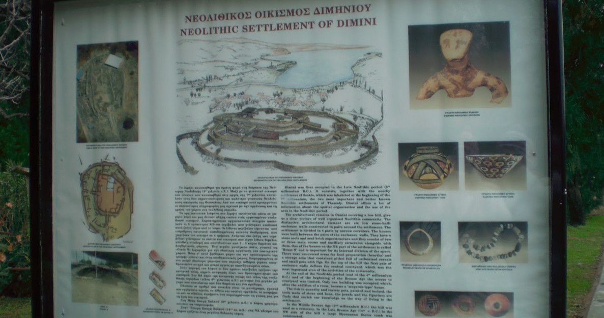 Археологические раскопки Димини ведутся к западу от современного поселения, носящего то же имя. Город возник около 4800 года до нашей эры. Согласно одной из теорий, люди культуры Димини уничтожили культуру Сескло. На территории древнего города обнаружены две микенские гробницы, грандиозный дворцовый комплекс, а также глиняные амфоры, чаши и фигурки, декорированные росписью.