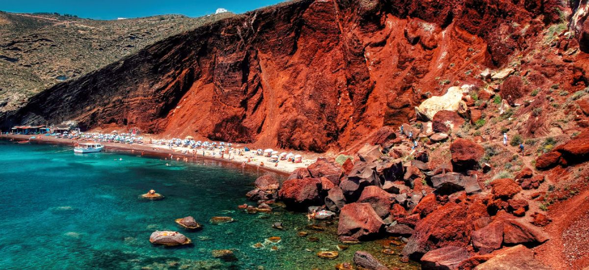 Красный пляж - один из самых необычных пляжей Греции. Его берег усыпан минеральной крошкой кирпично-красного цвета. Красные скалы, нависающие над берегом, создают неповторимый "марсианский" пейзаж.