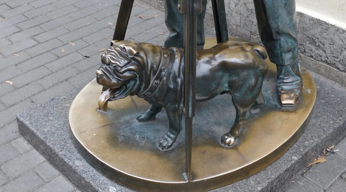 Возле ног фотографа можно увидеть английского бульдога с высунутым языком. Фигура фотографа как будто ежеминутно ловит сотни проходящих мимо пешеходов — туристов и коренных жителей Санкт-Петербурга.