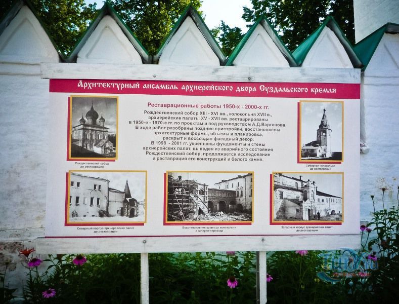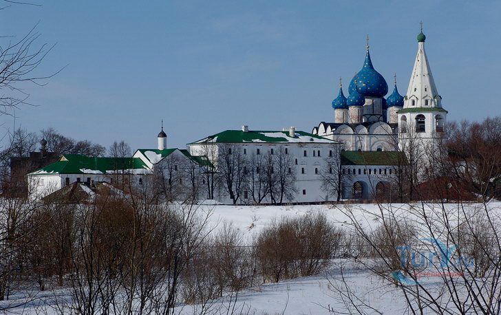 Суздальский кремль - это самая древняя часть Суздаля, вокруг которой разросся средневековый ансамбль Суздаля. Он расположен в излучине реки Каменка, в южной части города. На рубеже XI - XII веков здесь была сооружена крепость с кольцом земляных валов протяженностью 1400 м. На валах возвышались бревенчатые стены и башни. В Кремле помещались двор князя и двор епископа с городским собором, княжеская дружина и многочисленное окружение князя и епископа. Лишь валы остались единственными свидетелями древней истории города, восходящей к 1024 году. В начале XIII века внутри Суздальского Кремля, на месте Мономахова Успенского собора XI веке, был построен величественный белокаменный Богородице-Рождественский собор - самый древний и интересный памятник Суздаля. Во второй половине XV века были укреплены оборонительные сооружения, в 1677 году возведена рубленая сосновая стена с 15 башнями и воротами. К сожалению, все деревянные укрепления сгорели в 1719 году. Кремль сохранил земляные валы и рвы древней крепости, несколько церквей и ансамбль архиерейского двора с древним Рождественским собором.