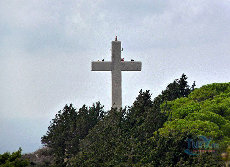 Этим крестом заканчивается Аллея Путь на Голгофу. Рядом с крестом находится смотровая площадка. Слева виден старый аэропорт Родоса, сейчас здесь базируются военные силы НАТО, справа - действующий аэропорт Диагорас, заходящие на посадку самолеты летят уже ниже Вас.