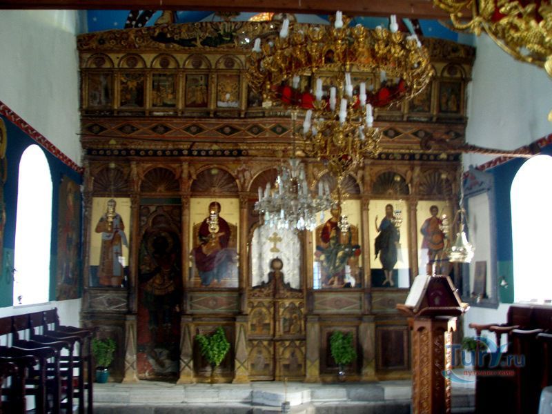 Это довольно простое здание, очень отличается от традиционных византийских монастырей в Греции. Центральный купол над нефом окрашен в яркий синий оттенок, и, вместо стандартных фресок, изображающих сцены из Нового Завета, весь покрыт белыми брызгами звезд. Деревянный резной экран является главной достопримечательностью монастыря. Он украшен иконами Иисуса Христа, Божией Матери, Иоанна Крестителя и других святых. По центру зала установлен изысканный стенд Библии и трон епископа.