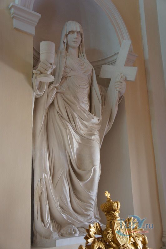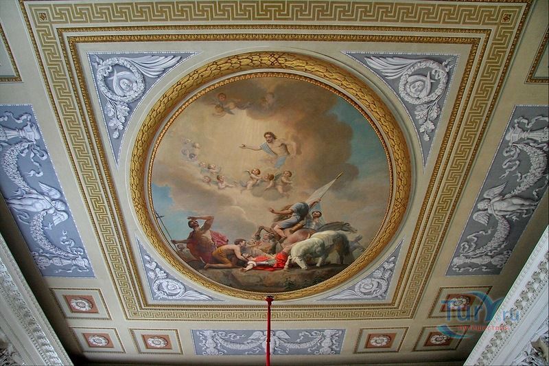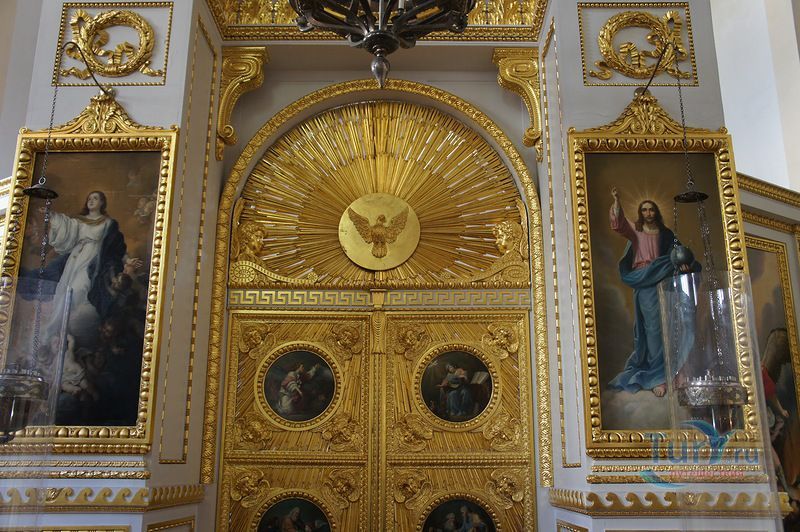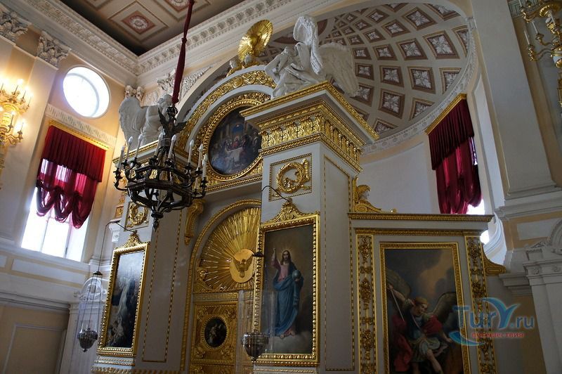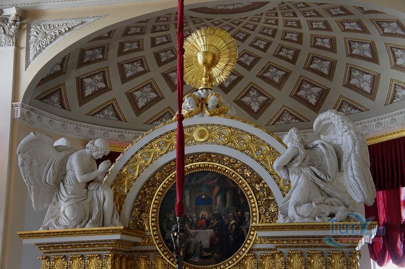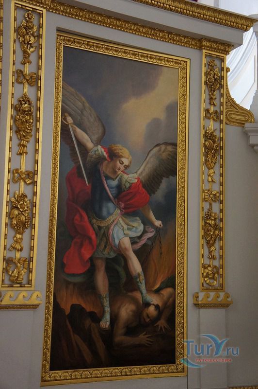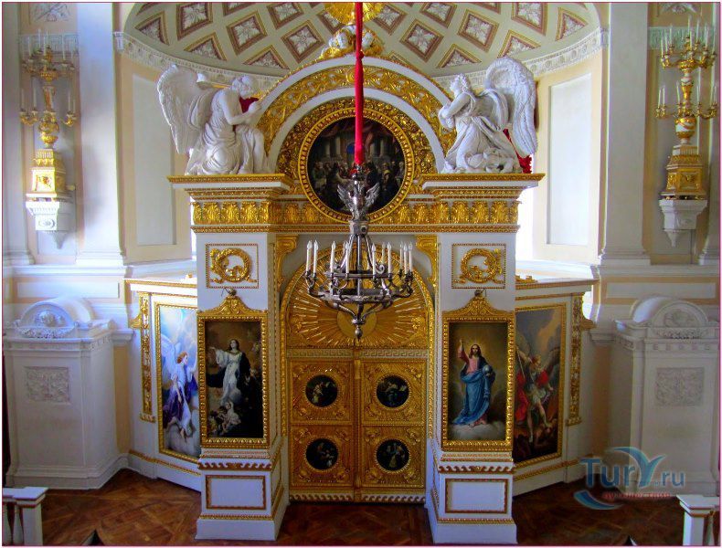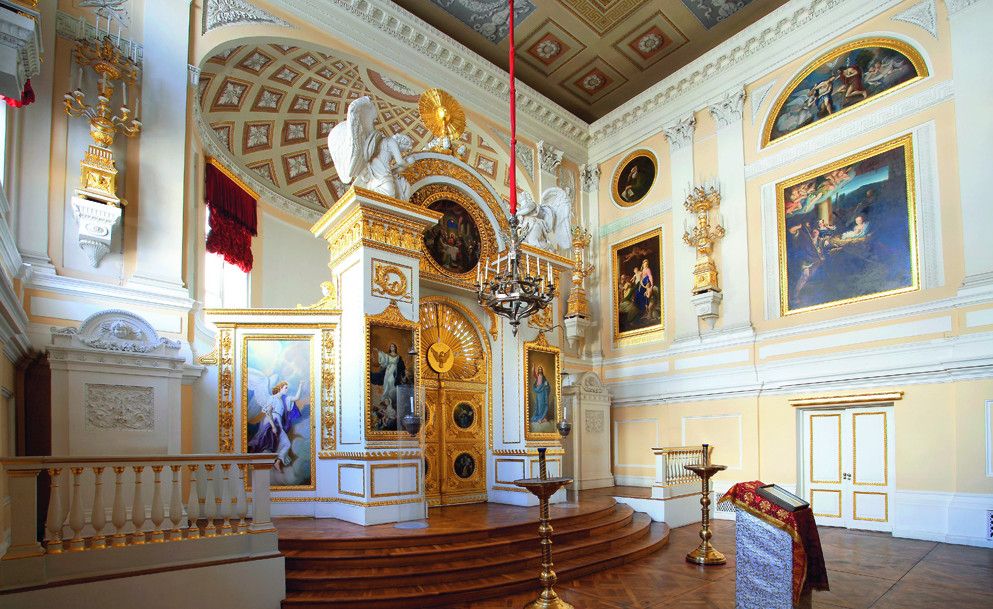 Дворцовая церковь занимает отдельный полутораэтажный корпус, примыкающий к Кавалерскому залу, из которого можно выйти на хоры церкви. Церковь была построена архитектором В.Бренной в 1799 году. Она занимает весь первый и второй этаж, со второго этажа попадаем на хоры, где находятся царские места - трон Павла I и трон Марии Федоровны. Потолок церкви украшен плафоном "Обращение Савла" - апостол Павел был небесным покровителем Павла I, образа в иконостасе принадлежат кисти художника Дж. Кадеса.