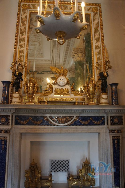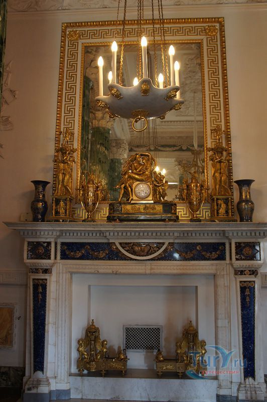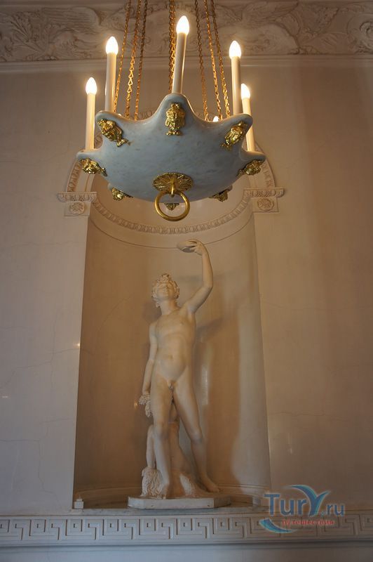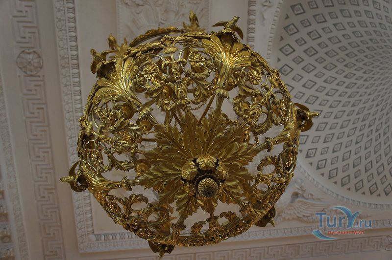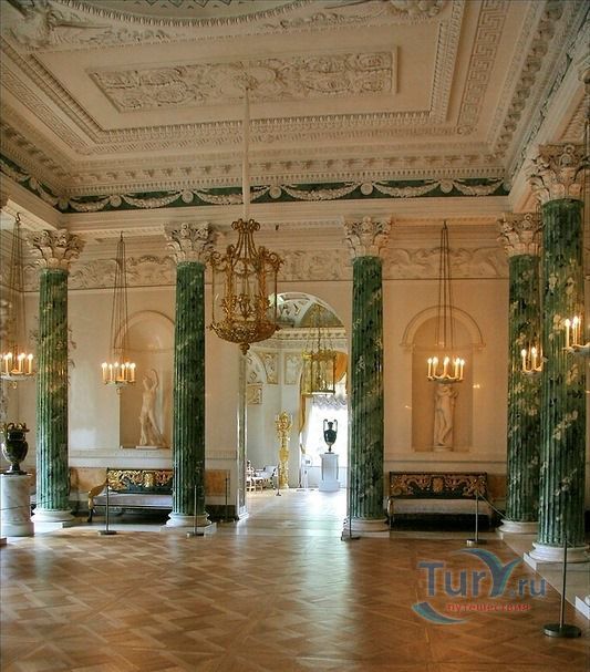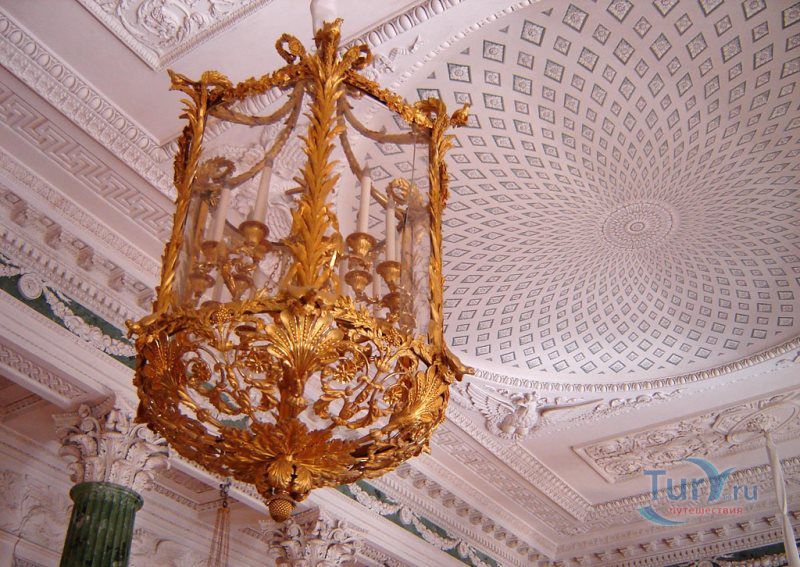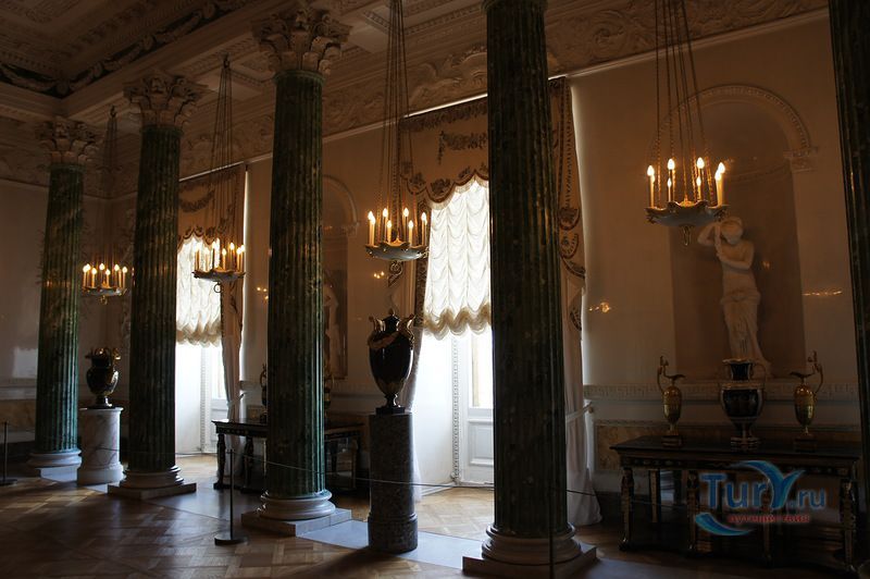 Греческий зал относится к парадным помещениям II этажа Павловского дворца. Из всех интерьеров дворца особое место занимают Итальянский и Греческий залы. Здесь проводились парадные приемы и балы. Огромный Греческий зал соседствует с залом Войны. Созданный Ч. Камероном, В. Бренной, зал позднее был восстановлен А. Воронихиным. Зал получил свое название потому, что он был оформлен в античном духе - по всему периметру колоннада коринфского ордера зеленоватого цвета, античные статуи в нишах, позолоченные светильники, подвешенные на длинных цепях между колоннами. На потолке - роспись, имитирующая украшенный лепкой купол. Насыщенный лепной орнамент в верхней части зала эффектно контрастирует с гладкой белизной искусственного мрамора стен.