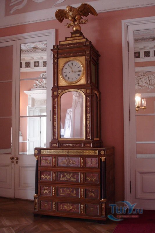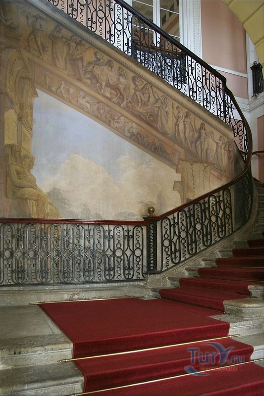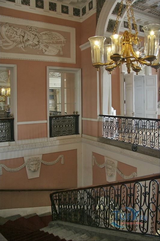 Парадная лестница ведет с I этажа, где расположен Египетский вестибюль, в Верхний вестибюль на II этаже. Над оформлением лестницы в 1789 году работал архитектор В. Бренна. Ее украшает объемная картина, которая зрительно увеличивает пространство. Вся правая стена лестницы украшена лепниной, исполненной в виде масок львов. Ступени лестницы покрыты красной ковровой дорожкой. Поднявшись по ним, мы попадаем в Верхний вестибюль Павловского дворца, где при жизни Павла I проводились разводы дворцового караула. Над последним маршем с конца XVIII века висит люстра, состоящая из деревянного стержня и ветвей из золоченого железа с шестью стеклянными фонарями. На верхней площадке лестницы установлены напольные часы в корпусе из красного дерева с отделкой в технике эгломизе.