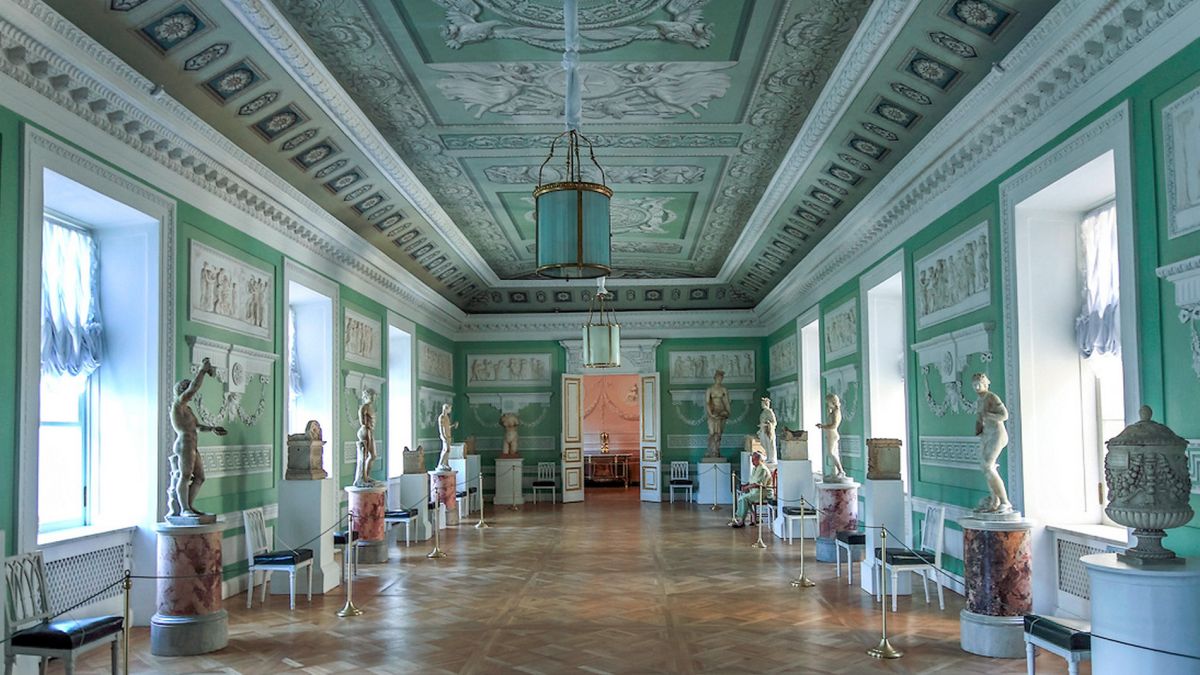 Кавалерский зал создавался в 1797 - 1799 годах по проекту архитектора В. Бренны и задумывался как галерея античной скульптуры. Для его оформления в Царском Селе было специально подобрано 8 статуй из приобретенного Екатериной II собрания англичанина Лайда Брауна. Статуи на пьедесталах из розовато-коричневого натурального мрамора были выстроены вдоль стен подобно колоннаде. У стены со стороны Оркестровой комнаты стояли 2 большие мраморные вазы с барельефами, и 2 круглые фаянсовые печи с барельефами в углах противоположной стены. Стены зала были окрашены в зеленый цвет. Интерьер зала дополняли стульями с обивкой из зеленого сафьяна. Он использовался для различных приемов, торжественных обедов и служил парадным залом,в котором античные статуи и бюсты вместе с мраморными пьедесталами являлись главным элементом в архитектурном образе интерьера.