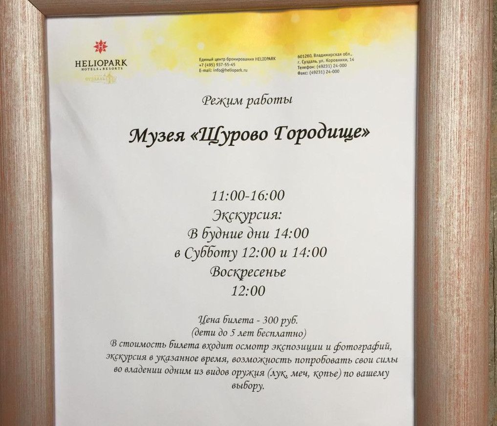На территории отеля HELIOPARK открыт первый во Владимирской области музей "живой" истории "Щурово Городище". Городище представляет собой реконструированное поселение древних славян, жилые и хозяйственные постройки: деревянные рубленые избы, срубная полуземлянка, глинобитная хлебная печь, кузница, оружейная, амбары, походная кухня древнерусской дружины. Основой "Щурова Городища" стали декорации фильма Павла Лунгина "Царь", который снимался в Суздале в 2008 году. Музей занимает территорию общей площадью около 1 гектара. Здесь Вы можете погрузиться в атмосферу Древней Руси, познакомиться с ее культурой и бытом.
