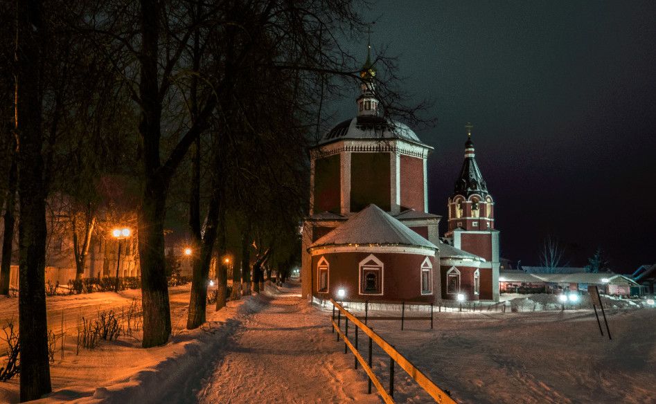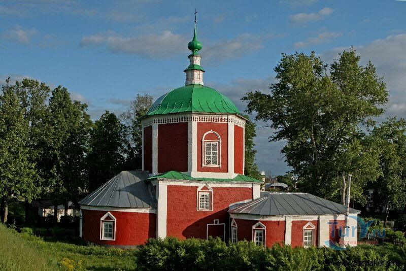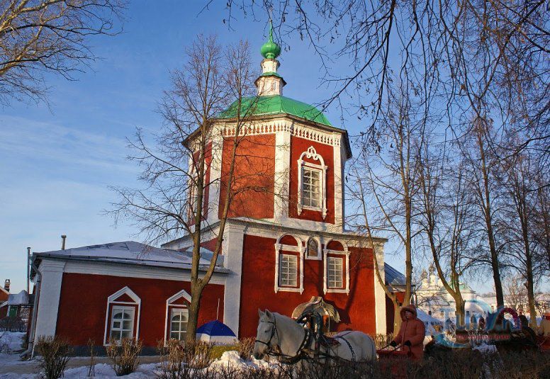 Успенская церковь - одна из редких в Суздале представительниц московского, или нарышкинского барокко. Во второй половине XV века на месте расположения церкви находился двор, принадлежавший великому князю Ивану III. В жалованной грамоте 1495 года, данной Спасо-Евфимиевскому монастырю на владение землями около Суздаля, написано: "... пожни около Ветельского пруда Успения Святыя Богородицы что на моем дворе...". Получается, что Успенская церковь стояла на княжьем дворе, являясь придворной. В описи города Суздаля 1617 года церковь значится деревянной, в таком состоянии она дошла до 50-х годов XVII века. Время постройки ныне существующей, каменной, неизвестно. Судя по ее архитектурным формам, можно проследить два строительных периода. Нижняя часть церкви - четверик, сохранивший небольшие части оконного наличника, типичного для второй половины XVII века, верхняя часть - восьмерик, может быть отнесен к началу XVIII века, так как наличники имеют завершения в виде волют, характерных для строительства времен Петра I. Широкий восьмерик на четверике украшен в этом архитектурном стиле - не очень пышно, но изящно. Широкий купол церкви увенчан небольшой главкой на высоком барабане интересной двухъярусной формы.