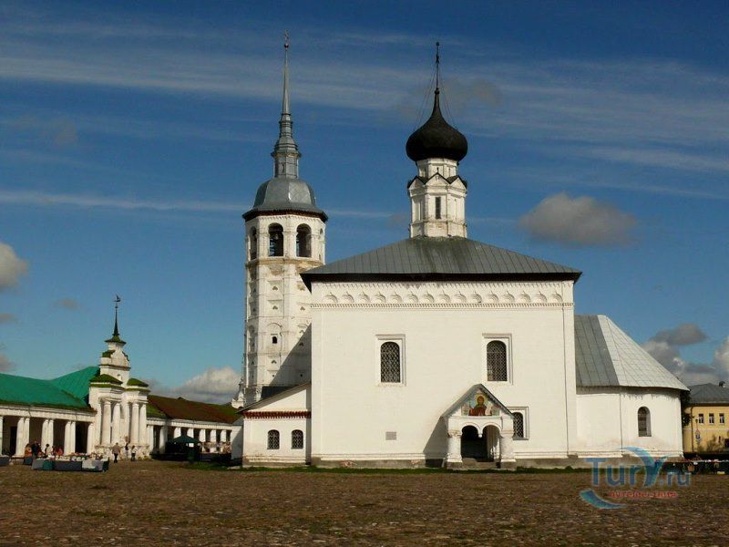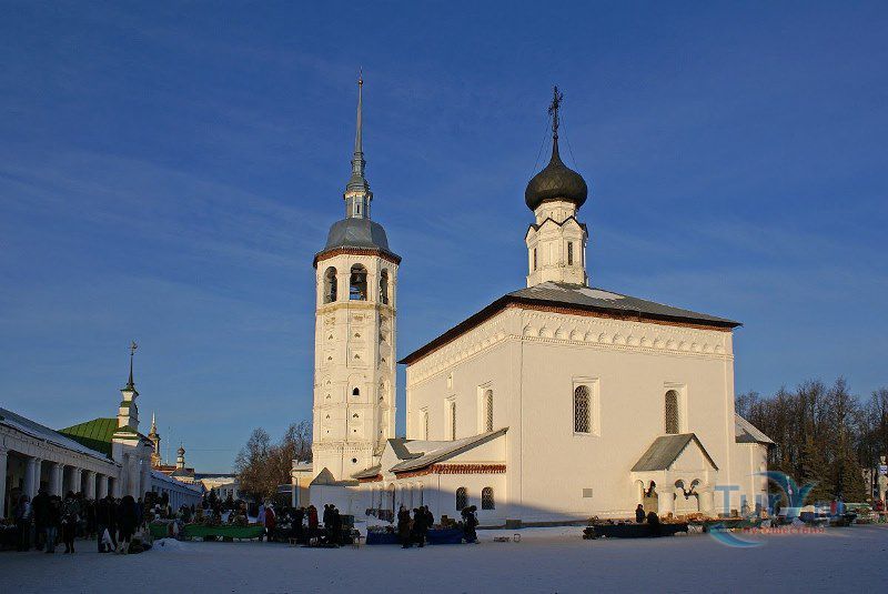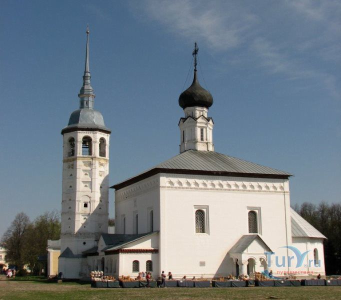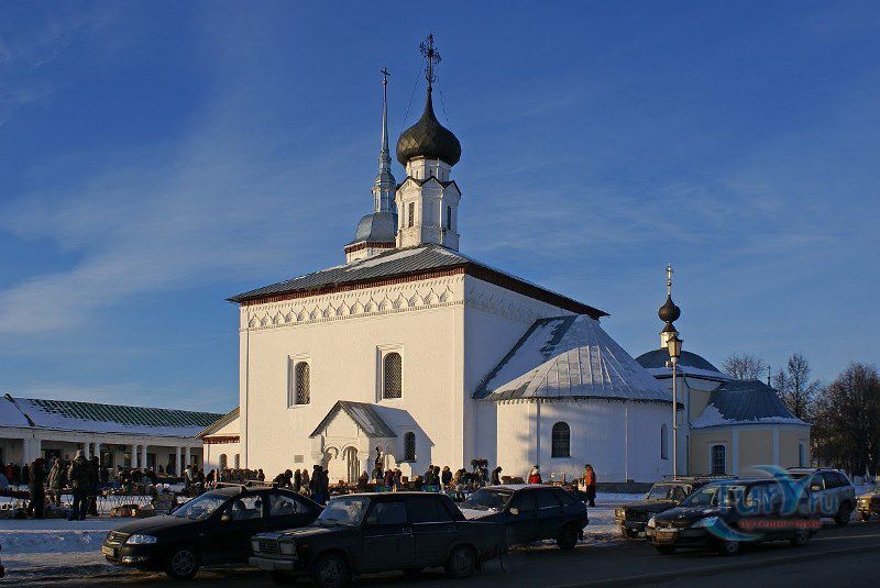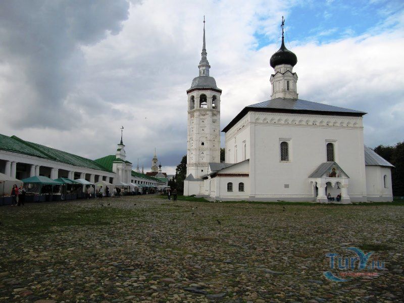 Посередине площади, около торговых рядов, находится Воскресенская церковь с высокой колокольней. Церковь на торгу была построена в 1720 году на месте старой деревянной церкви, сгоревшей годом ранее. В описи города Суздаля 1617 года она записана так: "позади рядов церковь приходная деревянная верх". Она просуществовала до пожара 1719 года и была заменена каменной. О том, что эта церковь существовала еще в XVI веке, свидетельствует надпись на колокольне, сделанная при Иване Грозном. Основной объем церкви строг, почти лишен какого-либо декоративного убранства, за исключением парадного крыльца с арками и круглыми столбами, и неширокого карниза из мелких арочек. Даже окна храма обошлись без наличников. К северо-западной части паперти примыкает колокольня - высокий восьмерик на низком четверике, завершенный шпилем. Изначально колокольня была невысокой. Поэтому ее пришлось надстраивать, одновременно богато украсив карнизами и разноцветными изразцами. В верхнем ярусе были сделаны новые высокие арки звона, а старые заложили; их следы до сих пор видны примерно на уровне середины колокольни, так что можно представить, какой высоты она была прежде. Высокий шпиль колокольни - свидетельство влияния петербургской архитектуры: эта черта во многом напоминает колокольню собора Петропавловской крепости.