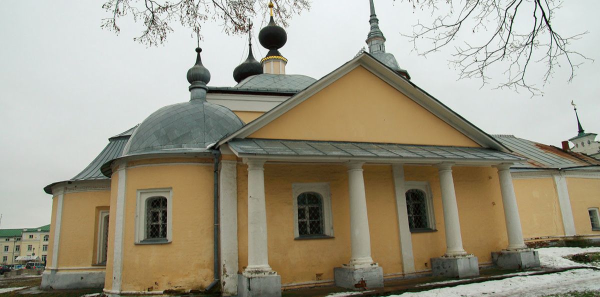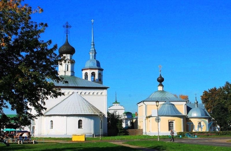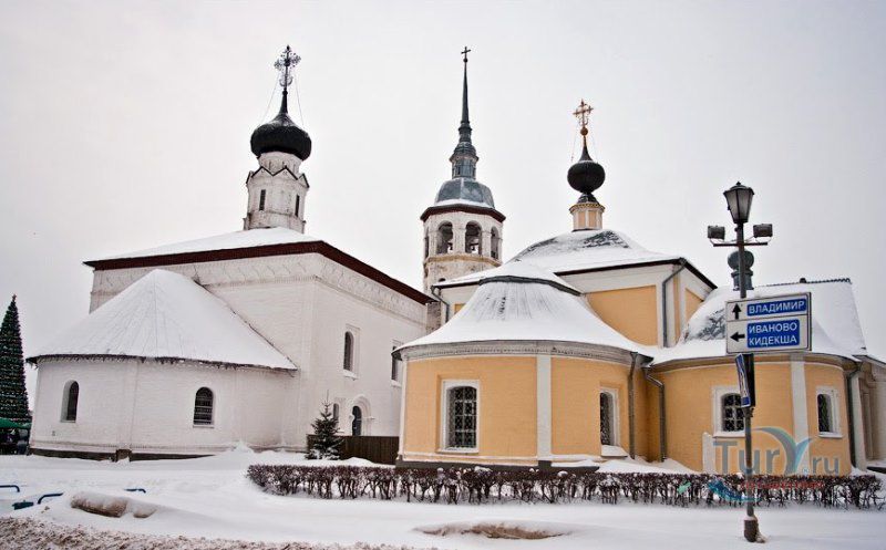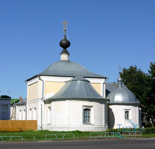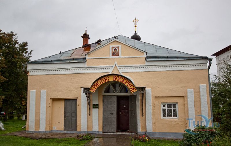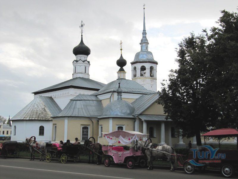 Казанская церковь с приделом Леонтия расположена рядом с Торговыми рядами, на торговой площади. Она также как и, рядом стоящая Воскресенская церковь сгорела во время большого пожара в Суздале 1719 года. Эта "теплая" церковь была пристроена к Воскресенской в 1739 году. После чего многократно перестраивалась, поэтому о ее первоначальном облике судить сложно. В ее достаточно эклектичном внешнем облике интересен кружевной металлический гребень на коньке крыши - черта народного искусства.