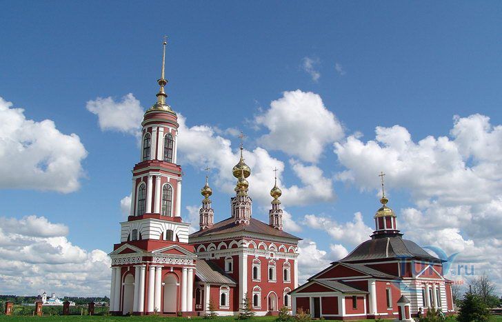 Церковь Михаила Архангела с колокольней - это самая высокая из трех церквей в Михалях. "Летняя" пятиглавая церковь с колокольней была построена в 1769 году. Ее высокий четверик отличается богатым декором: оба яруса окон обрамлены пышными наличниками, выделяющимися белым цветом на темно-красном фоне стен. Колонки наличников - ребристые, что придает им еще бóльшую узорчатость. Над вторым ярусом окон проведен богатый поясок, а под кровлей, немного выше - карниз. Центральный, световой барабан наряднее остальных; крест центральной главы украшен более сложным рисунком. С запада к церкви пристроена трапезная, соединяющая основной объем с высокой колокольней в стиле классицизм. Венчает колокольню стройный острый шпиль, опирающийся на сферический купол-основание. По своей композиции и по декору колокольня близка к самой высокой точке Суздаля - Преподобенской колокольне Ризположенского монастыря.