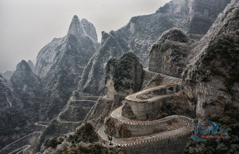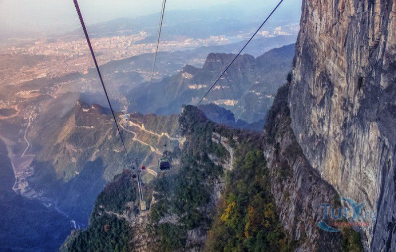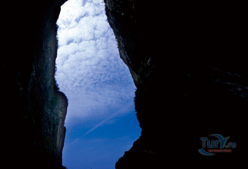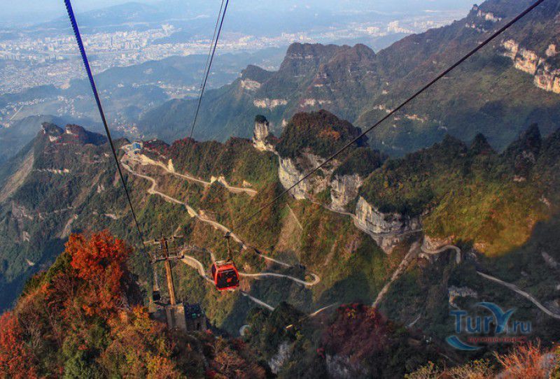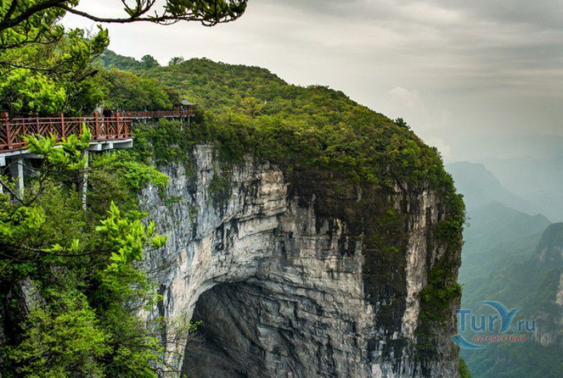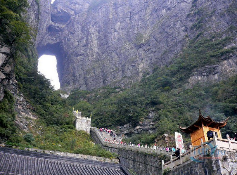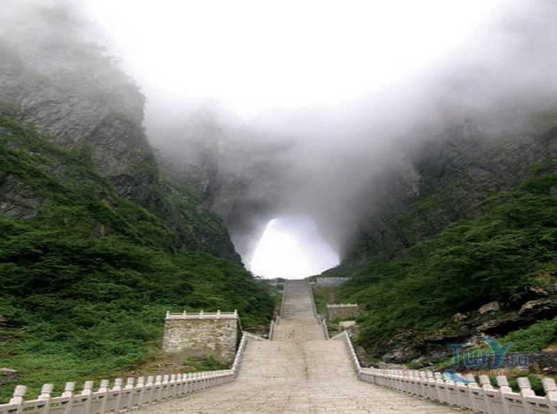 Гора Тяньмэнь (Тяньмэньшань) расположена на северо-западе провинции Хунань, в 8 км от центра города Чжанцзяцзе. Тяньмэньшань является одной из самых известных и посещаемых достопримечательностей Национального парка Тяньмэнь. Тяньмэньшань - первая гора в Чжанцзяцзе, которая была точно измерена специалистами, её вершина находится на высоте 1518,6 метров над уровнем моря. Мировую известность гора получила благодаря самой высокой в мире пещере, образованной в результате эрозии скальной породы. Пещера появилась в 263 году, когда большой кусок горы внезапно отвалился, образовав огромный проём высотой 131,5 метров, шириной 57 метров и глубиной 60 метров. Местные жители верят, что гора заключает в себе сверхъестественные, мистические силы, а пещера - это Небесные врата, которые охраняют Восемь Бессмертных. Очевидцы рассказывают о невероятном природном явлении - несколько раз во время значимых для страны событий (в 1949 году - образование КНР, в 1976 году - смерть Мао Цзэдуна, в 1989 году - подавление студенческих выступлений в Пекине и в 1998 году - крупнейшее наводнение В Китае) с вершины горы обрушивались потоки воды. Каждый раз водопад длился четверть часа и потом неожиданно прекращался. С давних времён ходят слухи о спрятанных в пещере несметных сокровищах, привезенных сюда одним из руководителей крестьянского восстания во времена правления династии Мин. Сотни кладоискателей покоряли вершину горы Тяньмэнь в надежде найти клад. Пока все попытки тщетны. А ещё говорят, что на горе живут единороги. Но и без мистики гора Тяньмэньшань привлекает тысячи туристов со всего мира своими потрясающими пейзажами. К вершине горы ведёт самая длинная в мире канатная дорога, её протяжённость - 7455 метров, количество кабин 98, перепад высоты - 1279 метров. В некоторых местах канатная дорога резко поднимается вверх под углом 37º, буквально "врезаясь" в облака. Автомобильная дорога, проложенная от подножия горы к её вершине, совершает 99 поворота, длина трассы - 11 километров, расстояние между поворотами от 200 до 1300 метров. Горный серпантин называют "Небесное шоссе". Непосредственно к пещере Небесные врата можно подняться по крутой лестнице, состоящей из 999 ступеней, время подъёма по ней - около 30 минут. От станции канатной дороги на вершине Тяньмэнь начинается пешеходный маршрут по проложенным по самому краю пропасти тропам, длина маршрута - 800 метров, а высота, на которой окажутся любители острых ощущений - 1400 метров над уровнем моря. Самый захватывающий участок - это стеклянная тропа. Прежде чем ступить на стеклянный пол, посетителей попросят надеть бахилы, и после этого можно "пройтись" по облакам. Виды, открывающиеся отсюда, очевидцы описывают как "волшебные", "потрясающие" и "невероятные". На самой вершине горы расположен буддийский храм, построенный во времена династии Тан. Храму уже более 500 лет, он и по сей день является одним из главных мест паломничества в провинции Хунань.