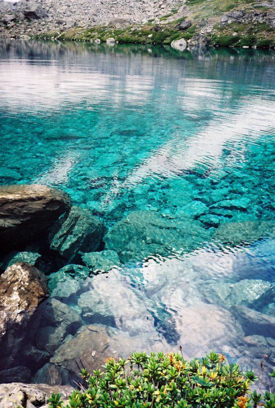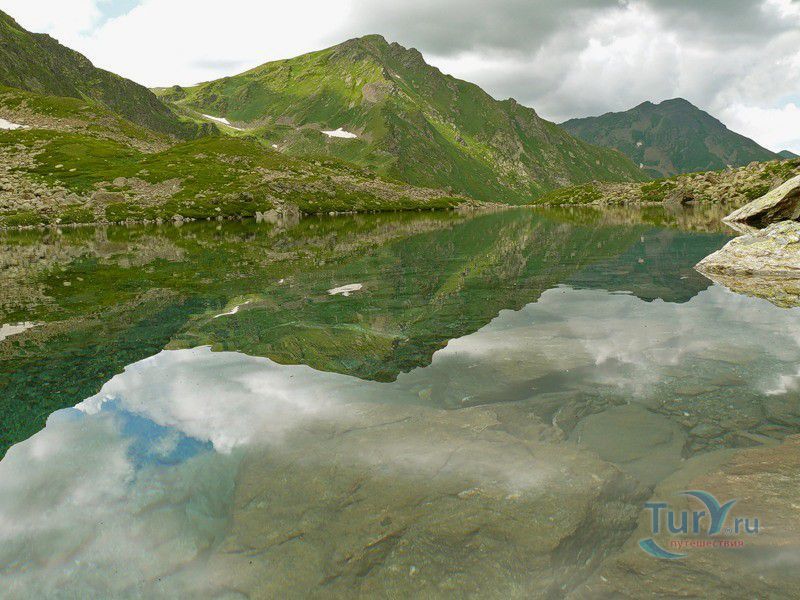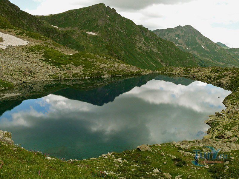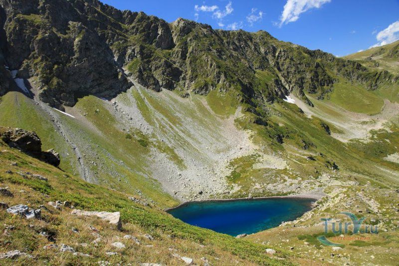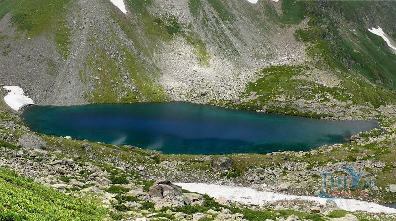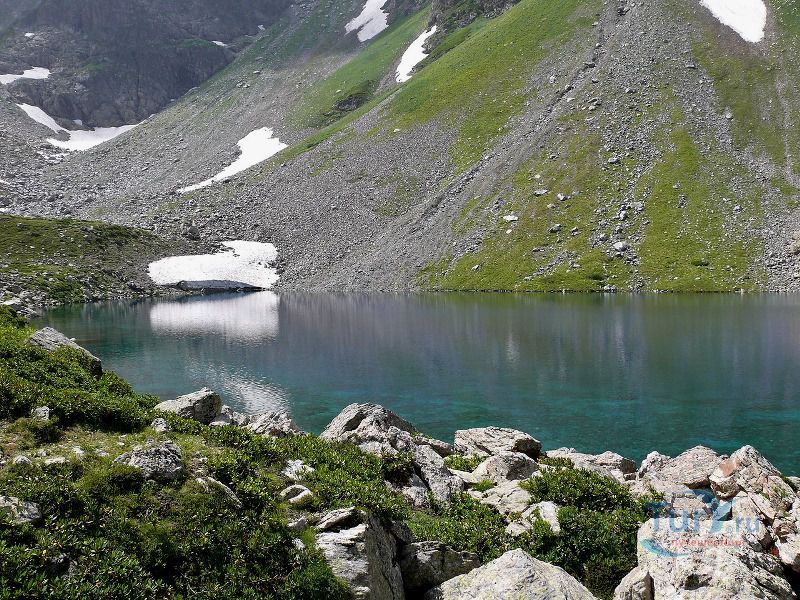 Озеро Семицветное лежит в верховьях реки Большая Дукка. Оно расположено на склоне хребта Аркасара, на высоте 2420 метров над уровнем моря. Озеро достаточно большое, его длина более 200 метров. Любуясь волшебной гладью озера с моренного вала, кажется, что вода в нем фиолетовая, а темные стены и обломки скал уходят в синюю глубину. С юга в озеро опускается мощный снежник, его куски плавают в виде небольших айсбергов до августа. При легкой ряби поверхность воды начинает играть радужными переливами, передавая игру солнечного света и отражения гор и облаков. За это оно и получило свое название "Семицветное". В первой половине лета берега украшены цветущим рододендроном. У озера и над ним есть места для стоянок.