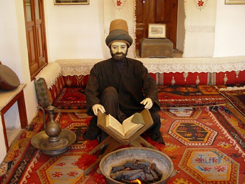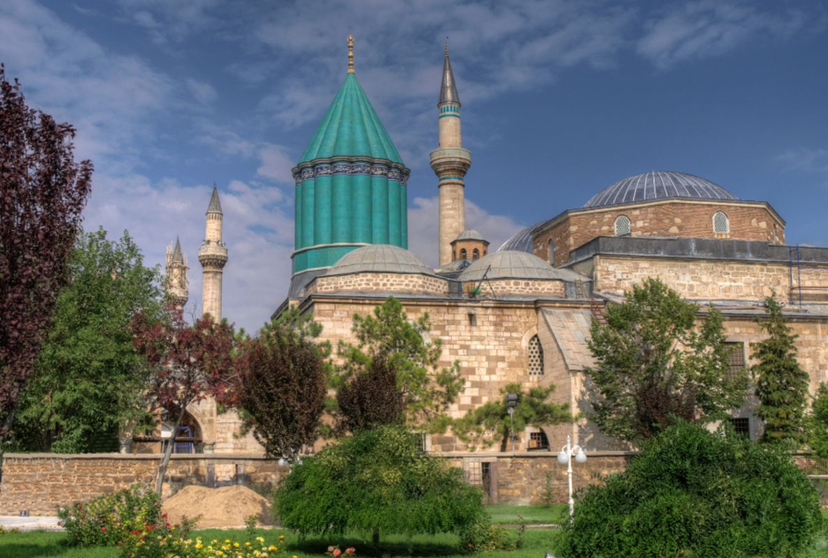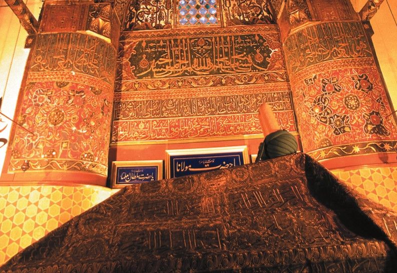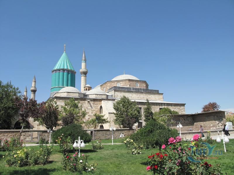 Музей Мевлана, один из лучших турецких музеев, располагается в гостинице (tekke), построенной во времена правления султанов Беязита II и Селима I в конце XV – начале XVI вв. Гостиница была подарена отцу основателя дервишского ордена Балаэтдину Веледу сельджукским султаном. Комплекс зданий включает семахане (semahane), где происходит ритуальная церемония вращения (sema), садирван (sadirvan) – место для ритуальных омовений, библиотеку, жилые и учебные помещения, мавзолей с гробницей Селаледдина Руми - основателя секты дервишей, удостоенного почетного титула Мевлана. Мавзолей Мевлана построен тебризским архитектором Бедреддином в 1274 г. Его форма типична для сельджукских гробниц: восьмигранная призма с равной ей по высоте восьмигранной пирамидой. В 1396 г. они были заключены в цилиндр и конус, выложенные керамической плиткой изумрудного цвета. Комната в мавзолее богато украшена орнаментом с исламскими изречениями и барельефом. Саркофаги Мевлана (1273 г.) и его отца Бахаэддина Веледа (Bahaeddin Veled), похороненного в 1232 г., покрыты тяжелыми коврами, вытканными из серебряных и хлопковых нитей. На коврах золотыми нитками каллиграфической арабской вязью нанесены суры из Корана, а также изречения самого Мевлана из Диван-и-Кебира. Рядом находятся саркофаги жены Мевлана, его детей, внучки, и других потомков, которые посвятили свою жизнь пропаганде его учения, саркофаги шейхов и других сподвижников. В семихане (semihane) собраны одежда и музыкальные инструменты, принадлежавшие самому Мевлану, а также сельджукские и оттоманские вещи, включая золотые гравированные Кораны XIII в. В музее Мевлана выставлен самый ценный шелковый ковёр мира.