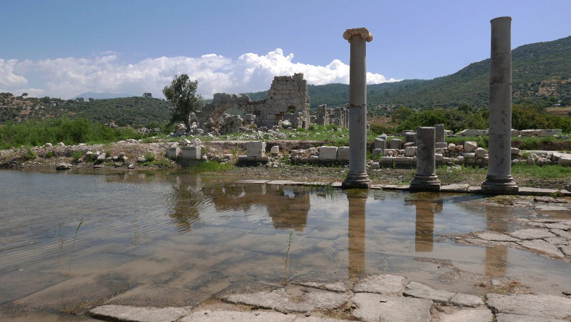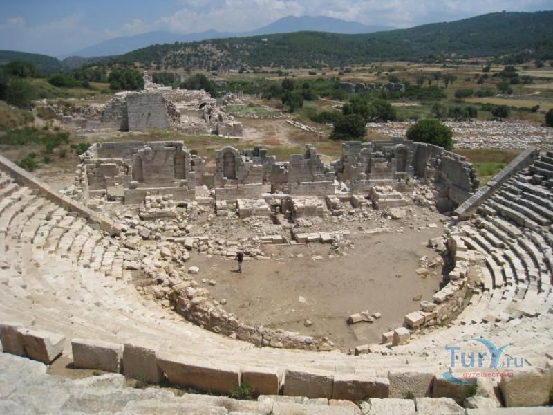 Древний город Патара известен своим храмом Аполлона со священным оракулом. Храм Аполлона со священным оракулом, считавшийся вторым по значимости после храма Аполлона в Дельфах, привлекал сюда паломников из всех греческих городов Малой Азии. В Патаре некоторое время прожил римский император Адриан, а по пути в Рим здесь останавливался Святой Павел. В IV веке город стал местом рождения будущего епископа Миры Святого Николая - прототипа рождественского Санта Клауса и Деда Мороза. Сейчас, несмотря на активно ведущиеся археологические раскопки, большая часть Патары все еще скрывается под землей. Единый въезд на территорию руин и пляжа находится на южной окраине деревни Gelemis. Вход на территорию археологических раскопок через трехстворчатую Римскую триумфальную арку Меттиджус Модестус, построенную в 100 г. н.э. в честь римского прокуратора Ликии. К западу от арки возвышается маленький холм. На нем была найдена голова Аполлона. Возможно именно там и стоял до сих пор не найденный храм Аполлона. К югу от холма находятся римские бани и заросший пальмами фундамент базилики. К западу от базилики можно увидеть лучше всего сохранившийся участок городских стен и построенный в коринфском стиле храм (II в. н.э.). Дальше к югу находятся бани Веспасиана (69-79 гг. н.э.), а к западу от них маленькая агора. Театр расположен к юго-западу от бань у одного из выступов акрополя. В процессе раскопок от песка было очищено 28 рядов сидений. Хорошо сохранилось здание сцены с пятью дверьми и пятью арочными окнами. Надпись на греческом языке гласит, что театр был построен на деньги граждан Патары – аристократки Vilia Procula ее отца. К югу от театра начинается тропинка, ведущая на вершину акрополя. Оттуда отрывается вид на море и заболоченную лагуну. Раньше она была морской бухтой, но в средние века обмелела, а сейчас еще и отделена от моря 300-метровой ширины дюнами.