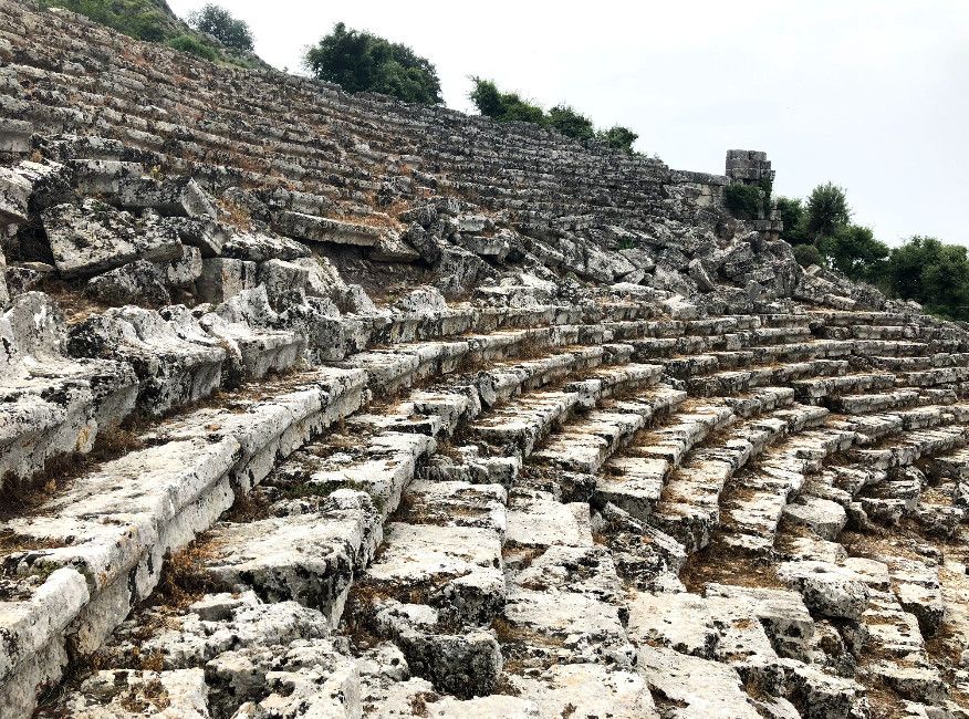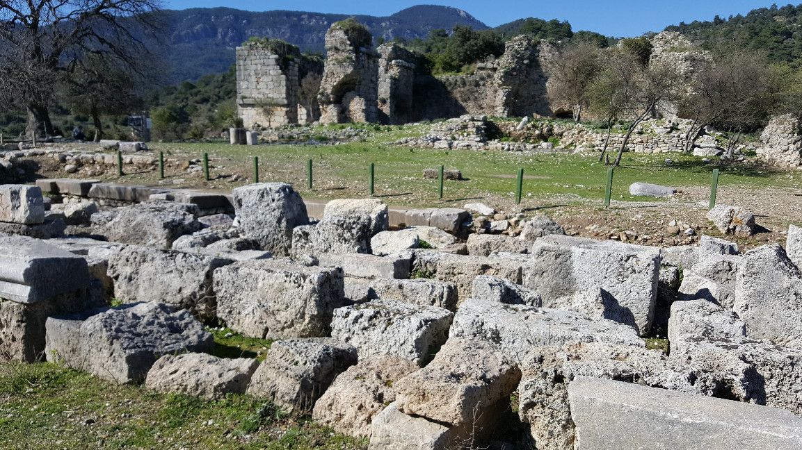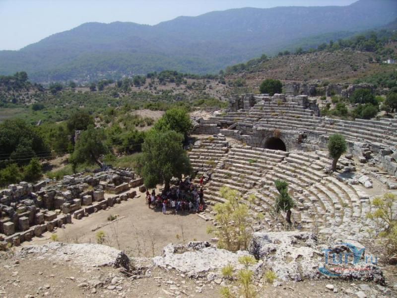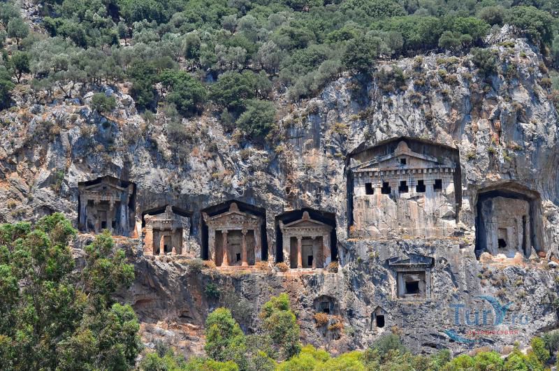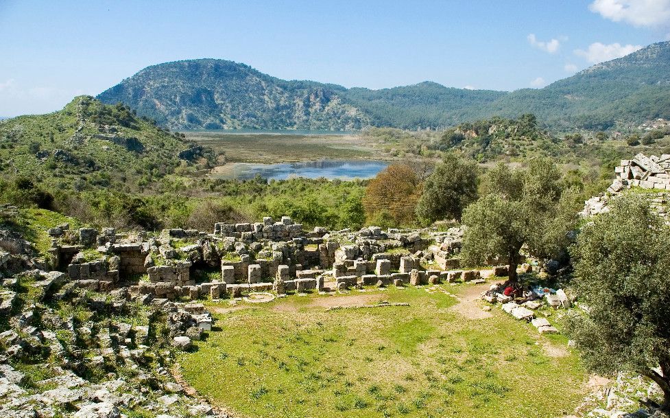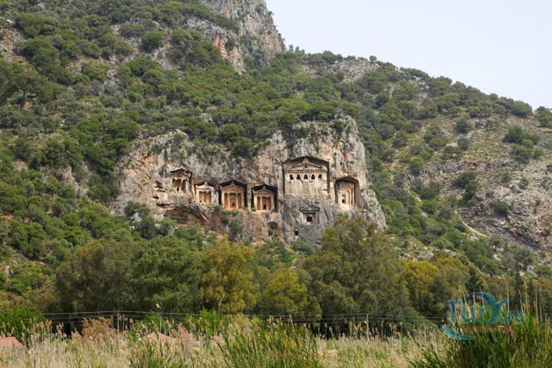 Древний город Каунос расположен на высоте 152 метра над уровнем моря, а акрополь находится на юго-западе города. Небольшая башня на полуострове, имеющая высоту около пятидесяти метров возведена в виде языка, расстилающегося между двух холмов в сторону моря. В течение древней и начала классической эпохи стены города, построенные на задней стороне Кауноса, Маленькой башни и Акрополя, а также внутригородские стены, образовали для города своеобразный защитный щит. Так как до сих пор ещё не на всей территории были произведены раскопки, до конца не ясна точная планировка античного города. Известно лишь то, что он был расширен террасами в период Гекатомнидлера. Предыдущие террасы были восстановлены, а в последующие периоды построены новые и более крупные. Название города упоминается уже в третьем тысячелетии до н.э. Каунос перенес присутствие на своей территории большого количества народов: ионийцев, карийцев, персов, ликийцев, римлян, византийцев и греков. Бейлик Ментеше распространил здесь в 1291 году свою власть, а в 1392 году эти земли были присоединены к Османскому государству султаном Баязидом. Одним из символов Кауноса стали скальные захоронения, датируемые четвёртым веком до н. э. Эти ясно виднеющиеся из Дальяна могилы использовались также во времена римлян. В могилах ликийского типа зачастую устанавливали лежак, состоящий из трех камней, На этот лежак укладывали покойника, а фасад могилы оформляли фронтоном и двумя ионийскими колоннами. Однако не ко всем гробницам можно подойти, для самых отважных здесь имеется веревочная лестница. Давно уже истлели останки захороненных здесь людей. Вечную память давно ушедших цивилизаций охраняют две львиные головы, которые с поверхности карийских гробниц смотрят друг на друга. Каунос являлся важным торговым и портовым городом. Со временем бухта в результате иловых наносов утратила свое значение и обмелела. По мнению Геродота, жители Кауноса сами себя называли уроженцами Гирита. Город был основан сыном Милетоса Кауносом, изгнанным из родительского дома из-за запретной связи со своей сестрой. Причал находится в десяти минутах ходьбы от города. Прибывающие сюда на яхтах оставляют свои корабли рядом с островом Деликли и подходят по каналу на шлюпках к причалу. Городской порт располагался в районе озера Сюлюклю у подножия акрополя. Море в те годы было на уровне самого акрополя. Когда вся Анатолия находилась под влиянием Персии, во времена персидского нашествия, Каунос перешел под управление Мавсола. После того как Александр Великий победил персов городом стала управлять принцесса Ада, потом Антигонус, а после Птолемеус. Город входил по очереди в Родосское и Бергамское королевства. Фрагменты расположенных на северной стороне стен являются средневековыми постройками. Самая длинная стена начинается от северной стороны порта и тянется до отвесных скал около деревни Дальян. Северная часть стены была возведена во времена правления Мавсола. Строения в северо-западной стороне были возведены во время эллинского периода, а те, что расположены непосредственно около порта, принадлежат еще более ранним эпохам. У подножия акрополя находится театр. Его партер насчитывает тридцать три ряда сидячих мест. Одна из расположенных к западу от театра построек, представляет собой церковь наподобие бази