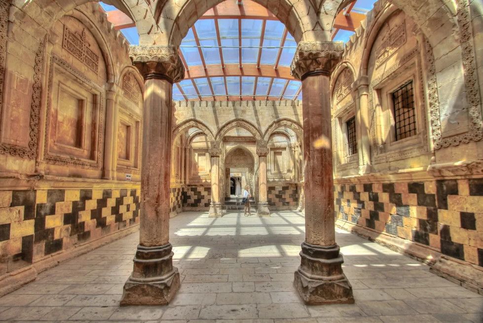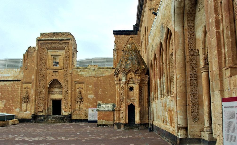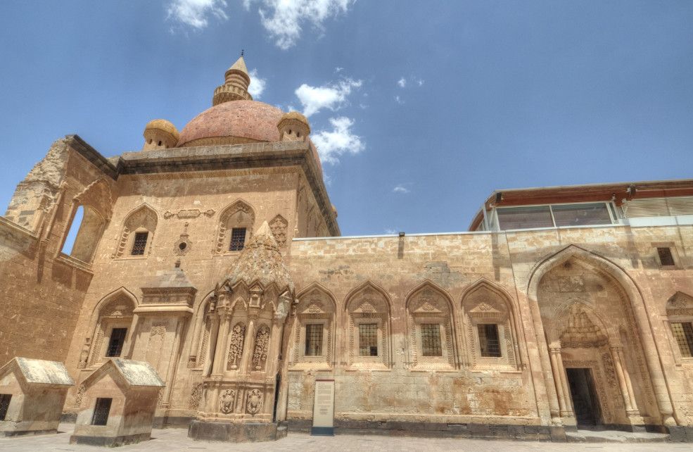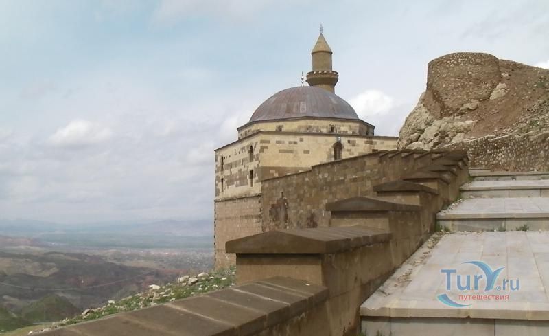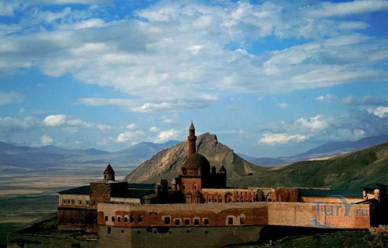 Дворец Исхак Паши является одним из наиболее масштабных и красивейших – немногие достопримечательности Турции могут похвастаться такой грандиозностью строения. Дворец был построен в последнем периоде Османской империи, уже после дворца Топкапы и является последним памятником ренессанса империи. Этот грандиозный дворец увлекает своей мощью и красотой. Его ценность состоит в том, что он представляет собой жемчужину тюркского архитектурного дела и конечно является дорогим произведением искусства. Расположен дворец на скалистой земле, которая близко расположена к равнине. Дворец Исхак Паши включает в себя множество архитектурных сооружений. Это фасад, дворы, гостиная, мечеть, кухня, бани, гарем, залы церемоний, арки, кладовые боеприпасов и продуктов, мавзолей, пекарня и подземелье. Немногие музеи Москвы могут похвастаться таким богатством экспонатов. Строительство дворца было начато в 1685 году и было закончено только в 1784 году. Занимает он площадь размером 115 на 50 метров. Архитектура дворца отражает черты, свойственные османской, сельджукской и персидской эпохам. Приезжающим туристам следует знать, что дворец представляет два двора, в которых находятся вспомогательные помещения. К сожалению, помещения, которые находятся на первом этаже, полуразрушены в настоящее время. А вот второй двор сохранился лучше и там все помещения представляют собой квадратную форму. Если заходить во дворец справа – то будет мужская половина, а за ним идет женская половина. Мечеть и мавзолей находятся в самом конце двора. Дворец Исхак Паши делится на два этажа, которые включают в себя 356 комнаты. В каждой комнате присутствуют камины из камня, в древние времена все комнаты отапливались центральной отопительной системой. Именно этим и прославился, стоящий рядом, город Дооубаязыт. Интересно, что самая первая система центрального отопления была установлена впервые в мире в этом городе. Мавзолей дворца построен тоже из камня, состоит из двух этажей и представляет собой архитектуру сельджуков. В мавзолее покоятся Чолак Абдул Паши, Исхак Паши и их родственники. В настоящее время дворец Исхак Паши является одним из популярных туристических комплексов. Туристы приезжают не только ради архитектурных сооружений. Здесь также очень красивые лесистые предгорья, красивейшие долины и горные пейзажи.