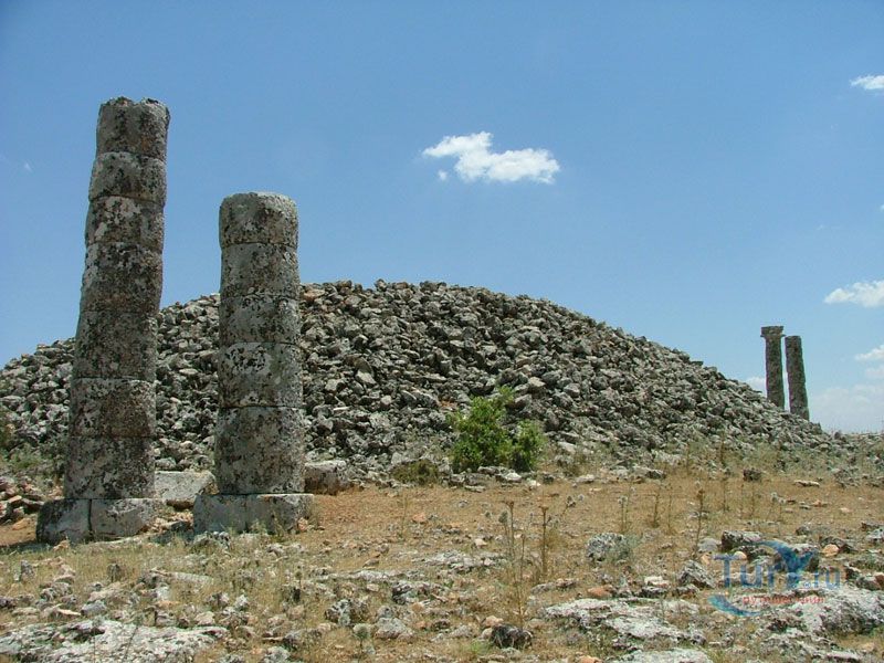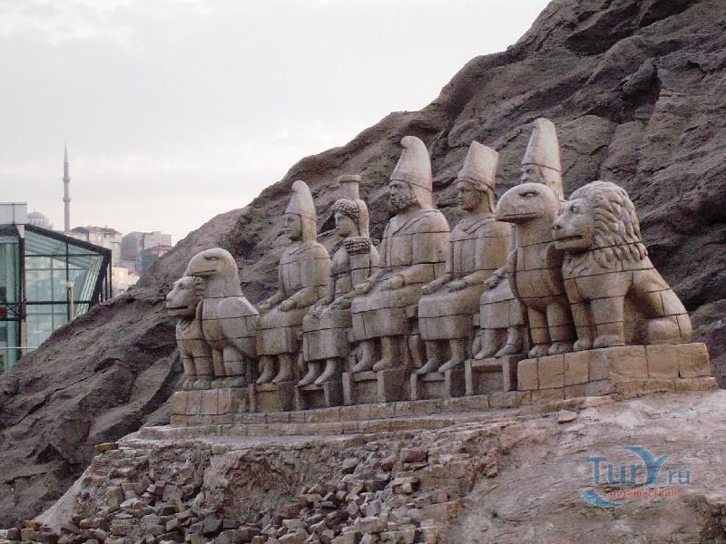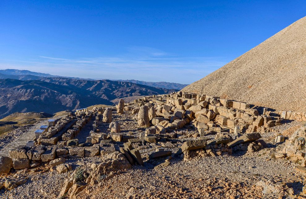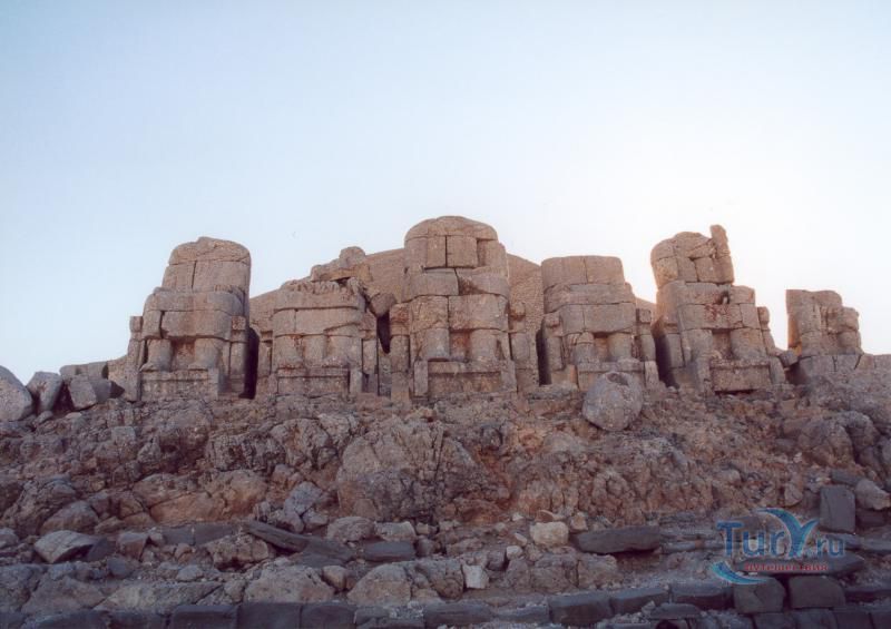 Национальный парк горы Немрут располагается на высоте 2150 метров над уровнем моря. Его название связывают с легендарным охотником Нимрудом (Нимродом, Нимвродом, Немрутом) - правнуком Ноя, упоминающимся в Библии. Нимруд был весьма популярным персонажем древних преданий, распространенных в странах Передней Азии. Будто бы именно Нимруду принадлежала идея строительства знаменитой Вавилонской башни - «дома Нимрода». Согласно армянской легенде, Немрут был неким иноземным царем, вторгшимся в Армению. Чтобы возвеличить себя, он вступил в состязание с Богом: приказал соорудить на вершине горы чудесный дворец и, поднявшись на его крышу, выстрелил из лука в небо, чем разгневал Бога. Тут же Немрут вместе со своим дворцом провалился в разверзшуюся пропасть, а на месте дворца образовалось озеро. У мусульман есть предание, что праотцу Ибрахиму (Аврааму) на роду было написано сразиться со злым царем Нимродом, который, зная об этом, пытался погубить его еще в детстве. Потерпев неудачу в строительстве Вавилонской башни, Ибрахим попытался взлететь в небо в ящике на четырех орлах, вскормленных мясом. Вершину горы Немрут-даг сегодня занимает огромный могильник со святилищем, главная часть которого состоит из искусственного холма в виде конуса высотой 50 м и диаметром 150 м, с двумя грандиозными террасами — восточной и западной. Однако, согласно найденным надписям этот курган никак не связан с легендарным Нимрудом, а является могилой царя Антиоха I (69-34 гг. до н.э.), правителя небольшого княжества Коммагена, зависевшего и от римлян, и от персов. Его столицей был город Самосата (Самсат), руины которого расположены неподалеку. Царь Антиох утверждал, что мать его происходит из рода Александра Македонского, а отец был потомком персидского царя Дария. Поэтому он пытался соединить традиции богов Запада и Востока и, подобно царям древности, повелел обожествить себя. На стене храма он приказал выбить свое завещание, которое должно было обессмертить его имя: «Мой день рождения должен отмечаться каждый год и каждый месяц. В эти дни главный жрец пусть возжигает благовония в честь богов и меня и выставляет самые изысканные блюда и вина на праздничные столы, и пусть пригоняет скот для жертвоприношения. Собравшиеся здесь мои подданные должны все отведать, и пусть будет праздник». На восточной террасе кроме главного алтаря сохранились пять замечательных, высотой 8—9 м, тронных статуй царя Антиоха I и греческих, переднеазиатских и иранских богов - Зевса-Ахурамазды, Аполлона-Митры-Гелиоса, Артагена-Геракла-Ареса и богини Тихе Коммагенской. Каждую статую охраняли стоявшие по бокам изваяния львов и орлов. Рядом - четыре монументальных рельефа с изображением царя и четырех богов, а также рельеф с гороскопом, где обожествленный правитель помещен в созвездие Льва. Статуи западной террасы находятся в значительно худшем состоянии. На обеих террасах уцелели также шесть рельефов царственных предков Антиоха I. Еще и сегодня фрагменты этих огромных скульптур поражают воображение туристов.