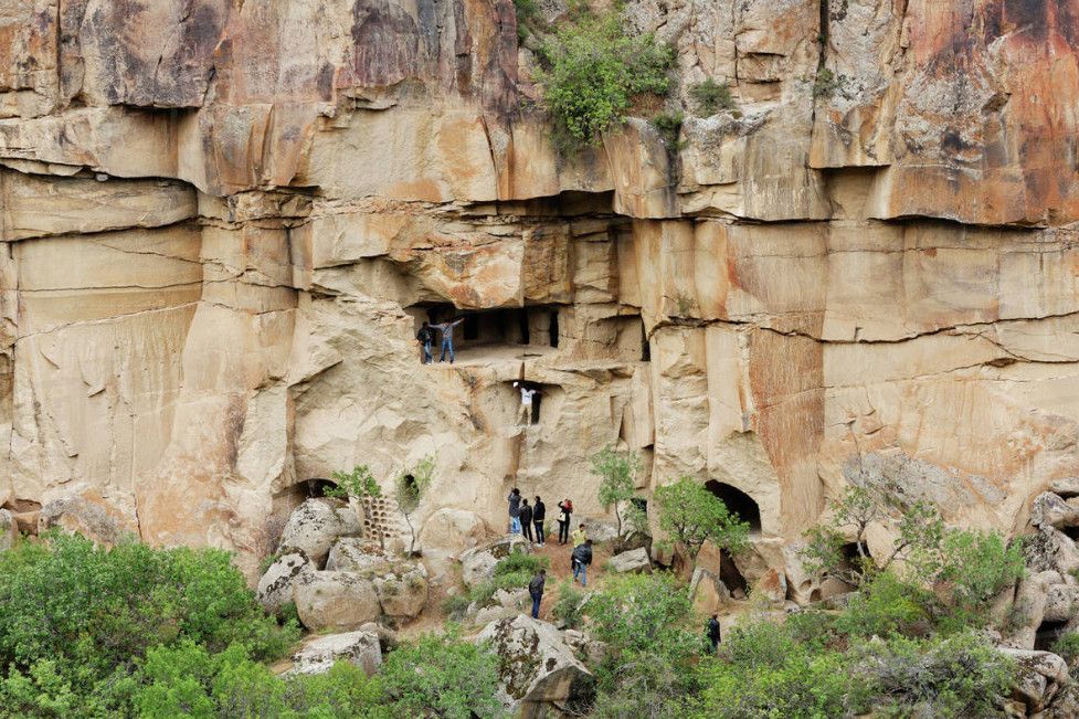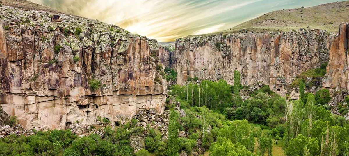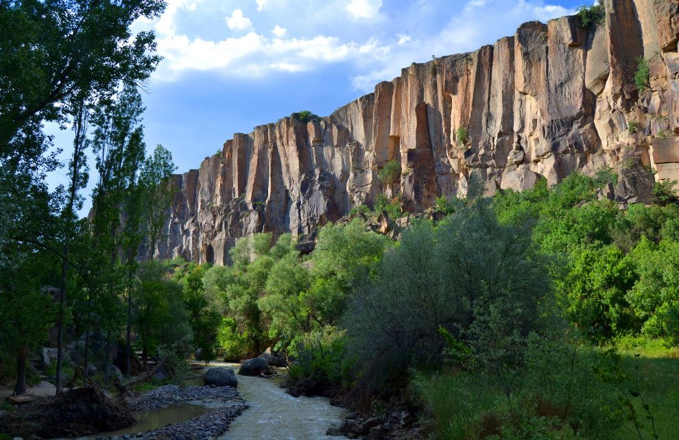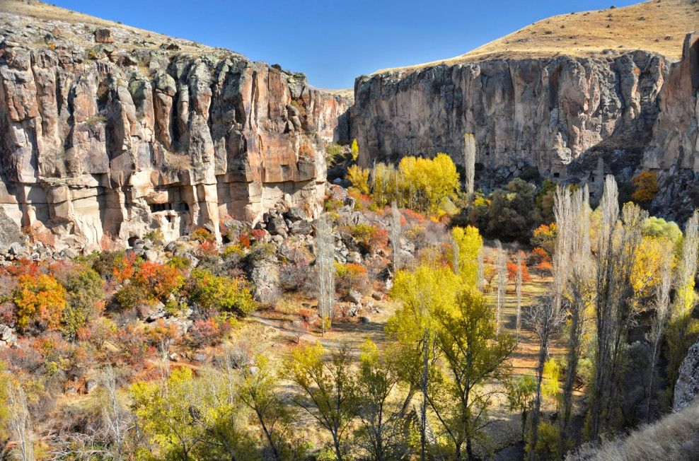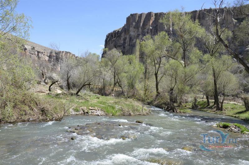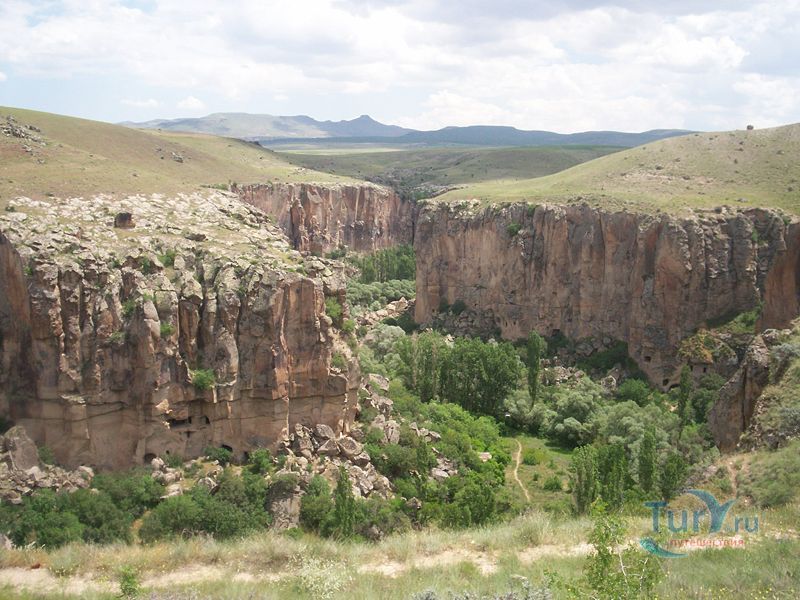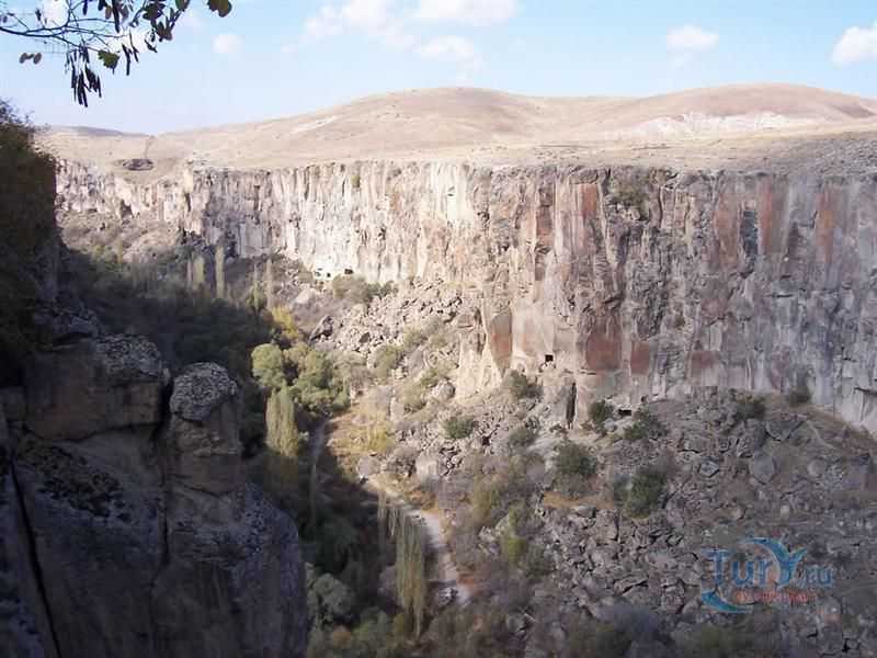 Долина Ихлара - это каньон общей протяженностью около 15 км и глубиной 100, местами 150 метров. Он был образован во времена формирования каппадокийского ландшафта. Но здесь главную роль сыграл вулкан Хасан, как и при формировании Монастырской долины около Гюзельюрта. Поэтому эти долины внешне похожи. На всем протяжении вас будет сопровождать река Мелендиз. В живописной долине расположен ряд интересных в художественном отношении церквей. Их строительство началось в IV веке. Они были украшены фресками сирийского происхождения, датируемыми первыми годами IX века. Поначалу фрески были очень простыми и малокрасочными (несколько оттенков красного по белому фону). Начиная с XI века, колористическая гамма становится более насыщенной; сирийско-египетский стиль разбавляется византийским влиянием, а также влиянием, которое оказывали религиозные мозаики наиболее крупных церквей того времени. С южной стороны вслед за Церковью Кузей Амбар Килисе идет Кокар Килисе, буквально "Церковь, которая плохо пахнет", IX века. Здесь интересны светло-зеленые фрески по серому фону и погребальные камеры. Пройдя Паренли Секи Килисе, можно заглянуть в Агач Алти Килисе, дословно "Церковь под деревьями". И действительно, долину заполонили деревья-исполины, росту которых благоприятствуют водный поток и климат, более мягкий, чем в районе верхней равнины. Неподалеку расположена Сюмбюлю Килисе, или "Церковь гиацинтов", фасад которой украшен арочными нишами. На противоположном склоне возле Каранлык Килисе, или "Темной церкви", стоит Иланли Килисе, или "Церковь змей", получившая свое название по фреске, на которой изображены змеи, нападающие на четырех грешниц. Из других церквей следует упомянуть Эритас Килисе, служившую усыпальницей. Ее фрески воспроизводят сцены из Жизни Христа и Богородицы. Возле деревни Белисирмы можно увидеть Ала Килисе, крестообразную в плане церковь, с сильно поврежденными куполами. Рядом находится хранящая бесценные фрески церковь Бахаттин Самаклыгы Килисе, свод которой опирается на одну колонну. Кирм Дамалти Килисе, или Церковь Св. Георгия, находится также в окрестностях Белисирмы. На противоположном берегу Мелендиза находится Дирекли Килисе – церковь с центральным куполом на четырех колоннах и с крестообразным в плане интерьером, стены которого украшены фресками, предположительно ХI-ХII вв.