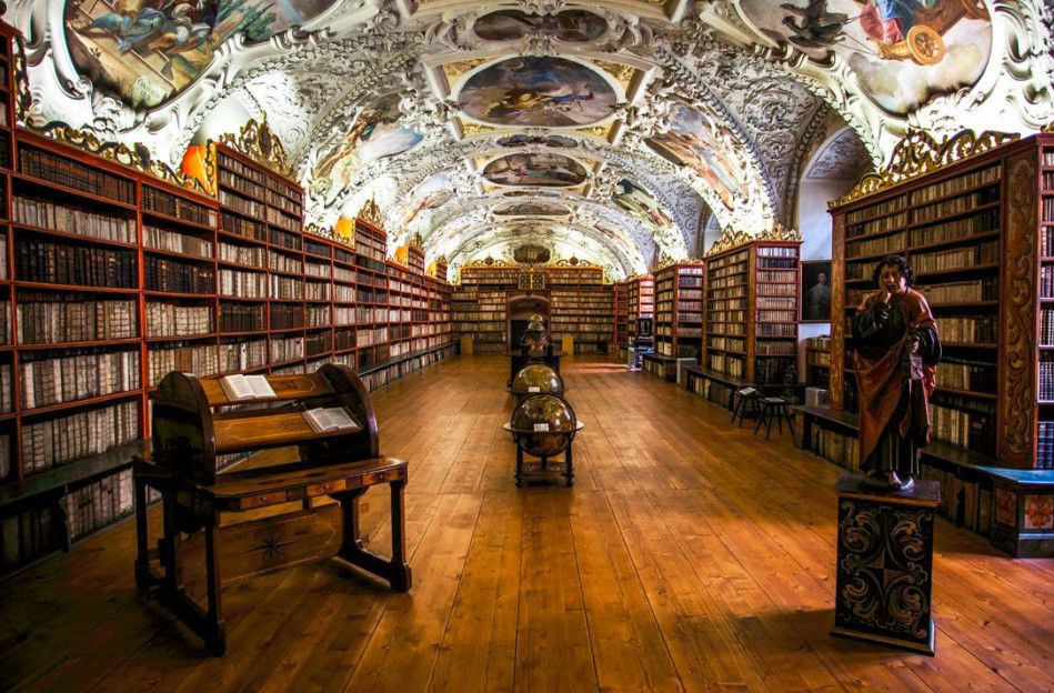 Библиотека в стиле барокко украшена прекрасными фресками на тему Науки и Искусства, а изображения на куполе представляют Храм Мудрости. Здесь хранятся сотни тысяч ценнейших книг по теологии, а центр зала украшают огромные исторические глобусы.